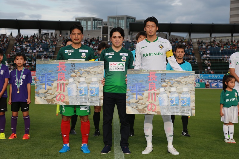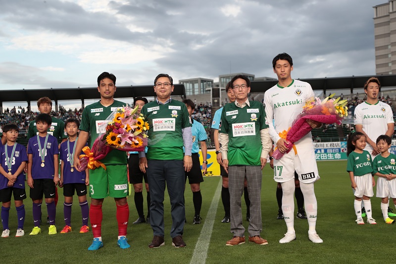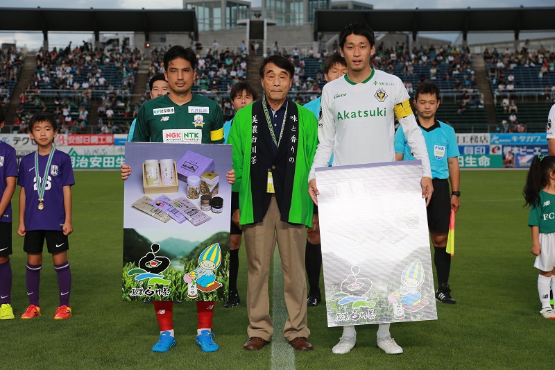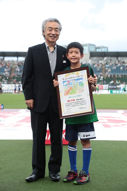 見事大賞に選ばれた伊藤さんの作品は「FC岐阜vs東京ヴェルディ」の岐阜市民招待チケットの券面にも採用。当日の試合前には表彰式もおこなわれました。