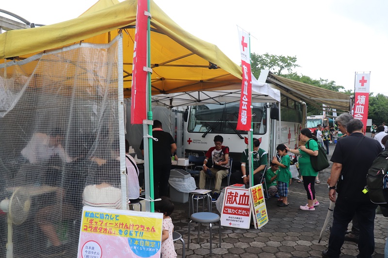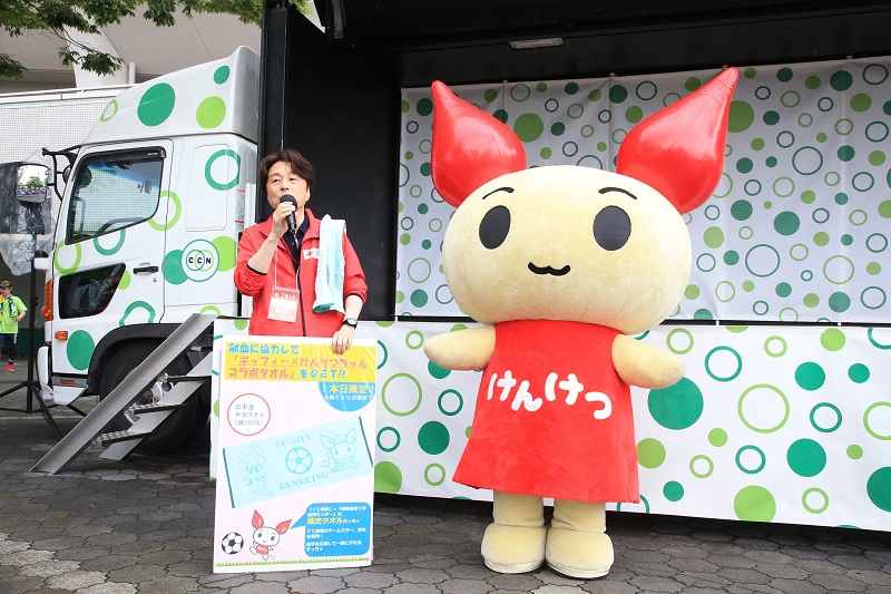 スタジアムで献血をおこないました。ご協力頂いた方には、ギッフィー×けんけつちゃんコラボタオルをプレゼント。