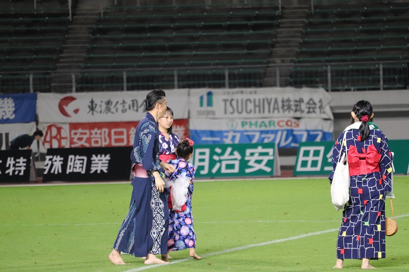 また試合終了後には、浴衣・甚平の方限定でピッチを開放。先ほどまで熱戦が繰り広げられていたピッチの上で思い思いに楽しんでいました。