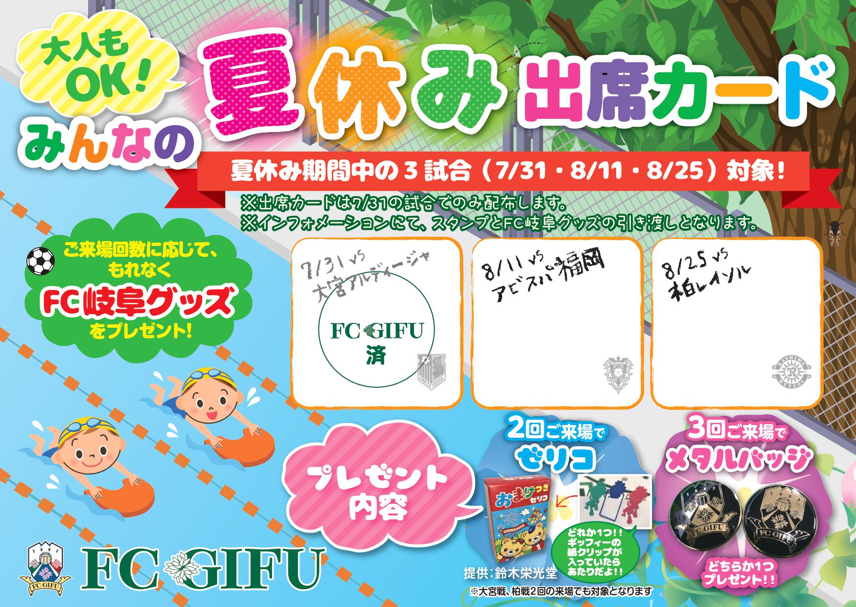 8月11日(日・祝)アビスパ福岡戦、8月25日(日)柏レイソル戦において、来場回数によってFC岐阜オリジナルグッズをもれなくプレゼント!