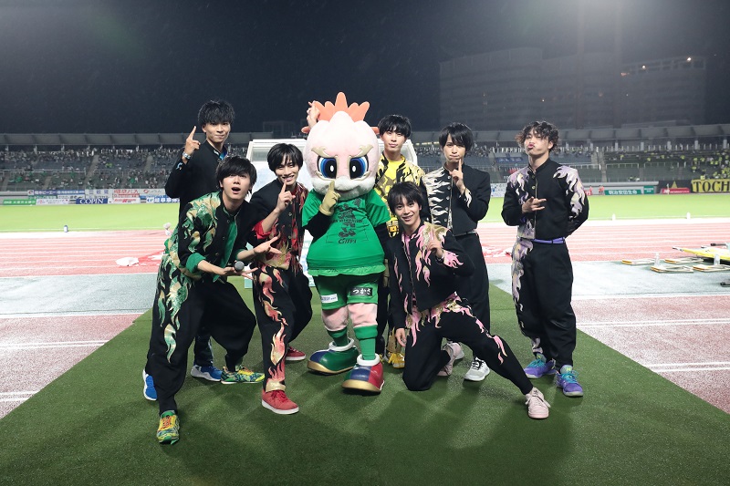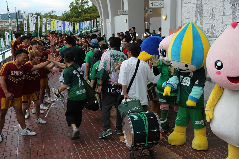 FC岐阜アンバサダーの「祭nine.」が来場!お出迎えや試合前パフォーマンス、試合前・ハーフタイムのスタジアムLIVE、空中始球式のキャッチ!など、会場全体を盛り上げてくれました!