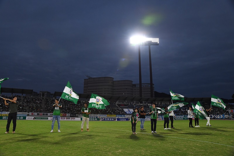 センターサークル応援団『FC岐阜スタジアムDJ久世良輔さん・FC岐阜応援マネージャー伊藤寧々さん・アクトフラッグ隊』