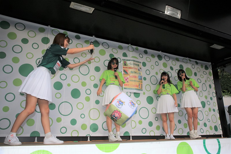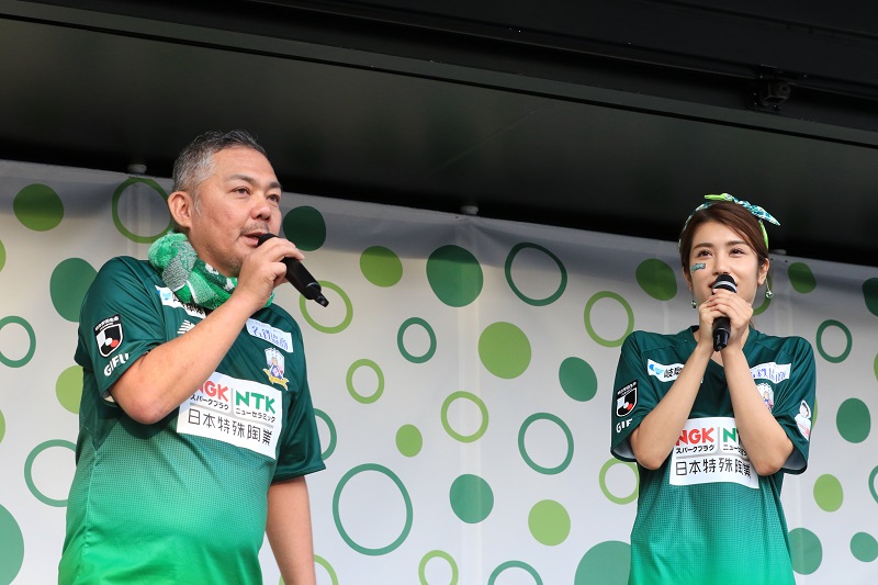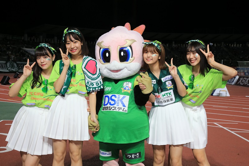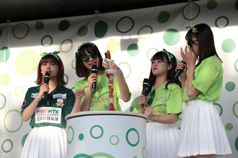 FC岐阜応援隊のSKE48から、応援隊長の北野瑠華さん・井田玲音名さん・竹内彩姫さん・日高優月さんが来場。