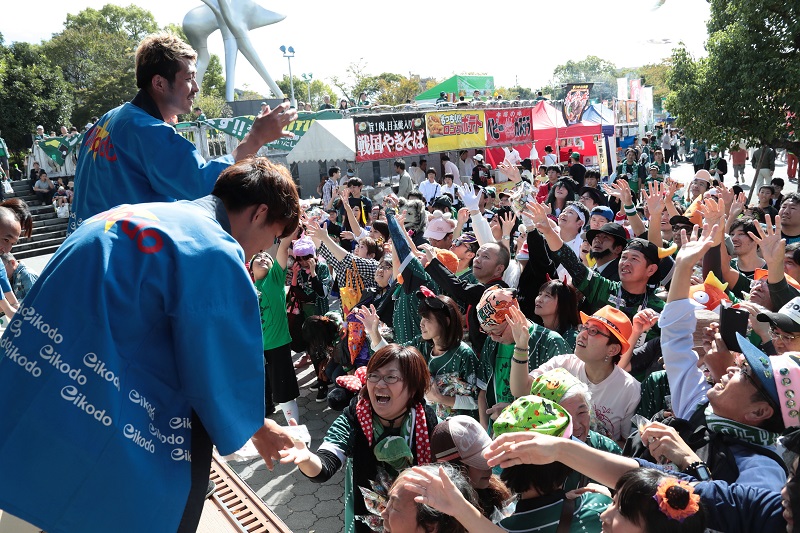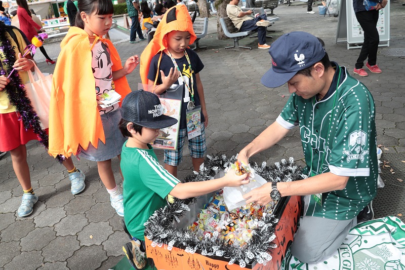 恒例のスタジアムお菓子まきが今回も開催されました。1回目は未就学児、2回目は小学生、3回目は仮装来場者を対象にお菓子まきをおこない、GGGやギッフィー・オ~レくん・長尾しおりさん・ミナモ、FC岐阜からは富樫佑太選手と横山知伸選手も参加し、ステージからお菓子をまいていただきました。