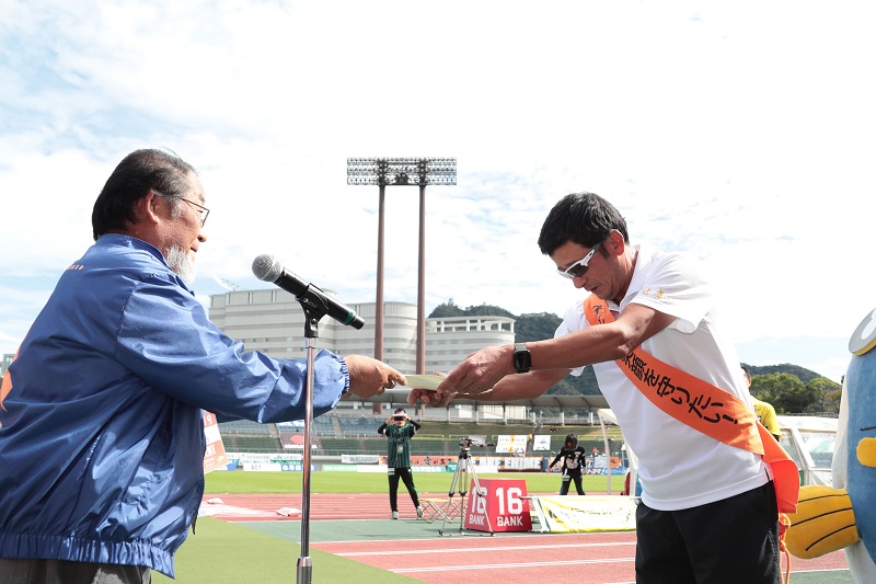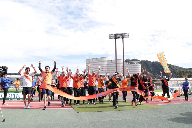 皆さんでたすきを繋ぎ、最後はスタジアムでゴール!子ども虐待防止を広めるオレンジリボン運動を多くの方にPRしていただきました。
