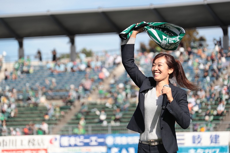 SUPER☆GiRLSのメンバーでFC岐阜アンバサダーの長尾しおりさんさんが来場。スタジアムお菓子まきやステージでの食レポ、ハーフタイムキャラバンやイベントのレポートなど、スタジアムを一日通して盛り上げてくれました!