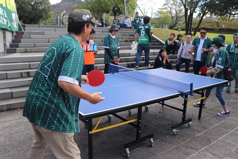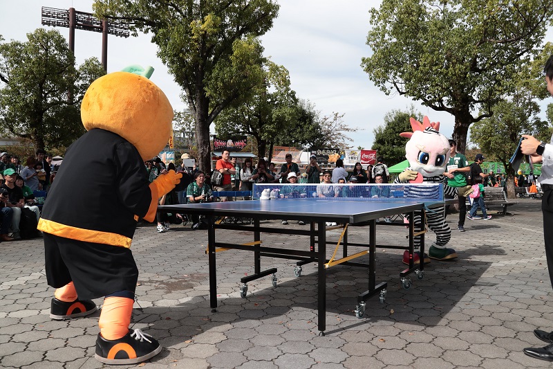 愛媛FCのマスコットキャラクター「オ~レくん」が来場!温戦卓球勝負やグリーティング、ハーフタイムキャラバンなど温戦マッチを盛り上げてくれました。