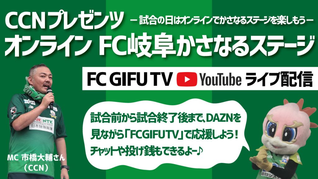 試合当日の2時間前から試合終了後まで、FC岐阜公式YouTube「FC GIFU TV」にてFC岐阜かさなるステージをオンライン配信いたします。