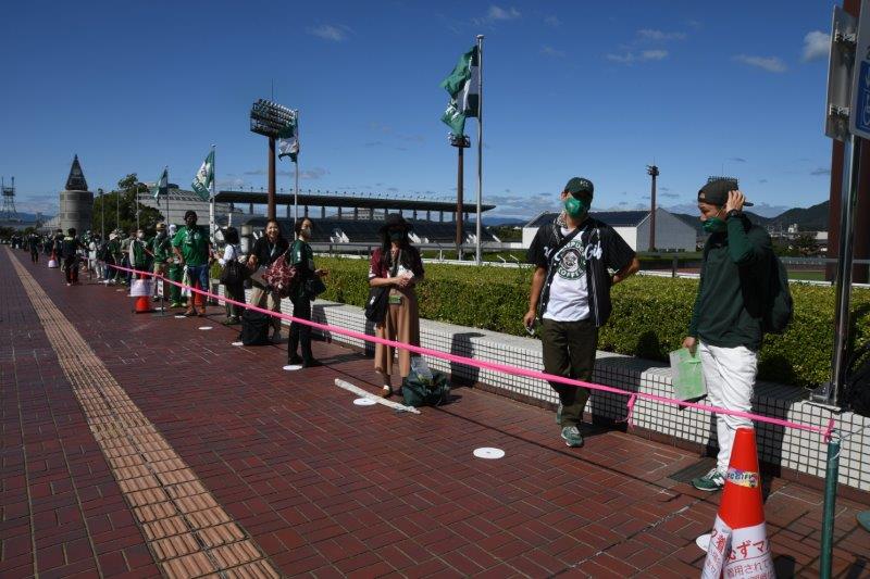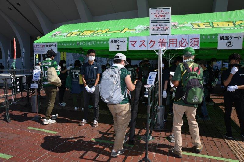 入場ゲートでの手指消毒と検温、社会的距離を保った待機列に、ステージイベントや試合の観戦時は前後左右1m以上空けての配置となっております。