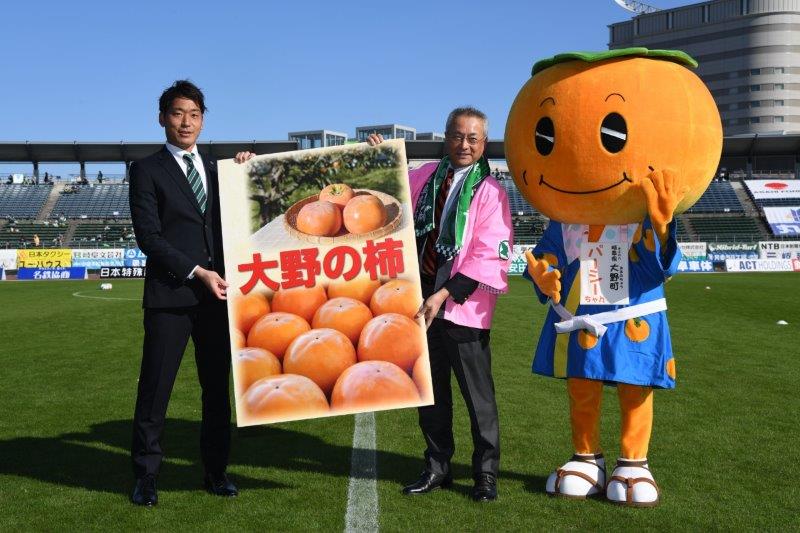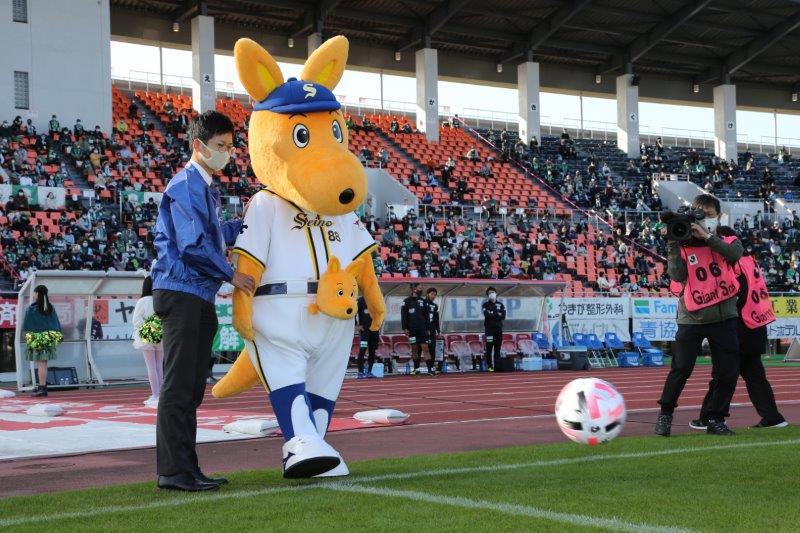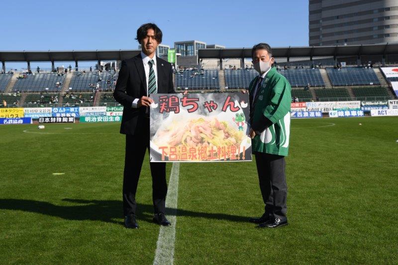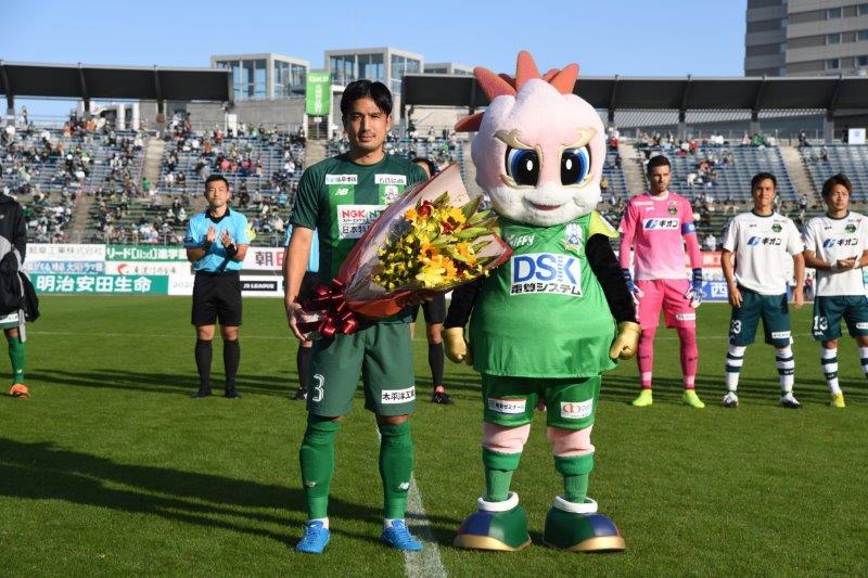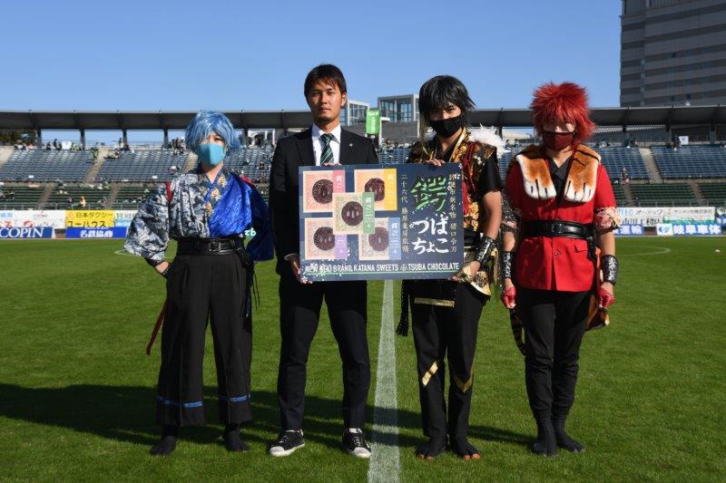 2020明治安田生命J3リーグ 第18節 アスルクラロ沼津戦に出場し、Jリーグ通算300試合達成となりました竹田忠嗣選手の記念セレモニーを実施。プレゼンターはギッフィーが務めてくれました。