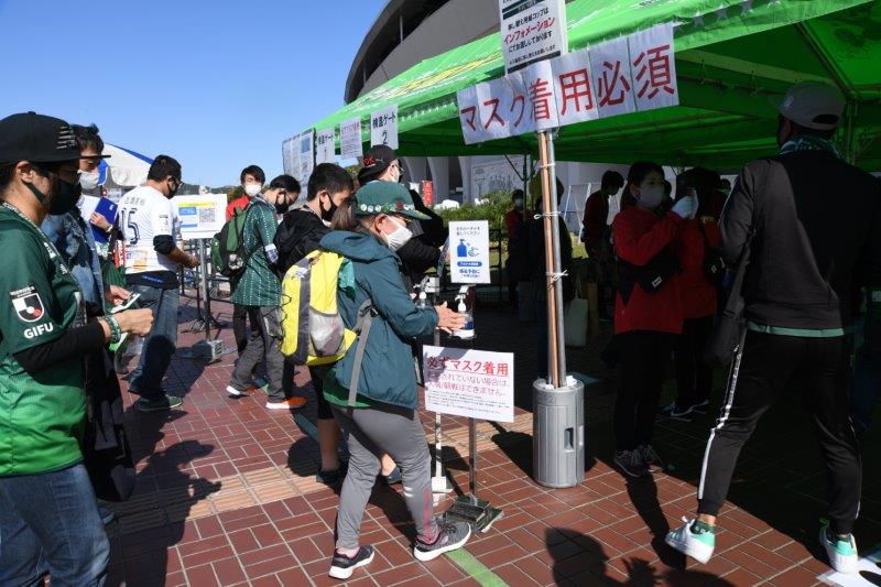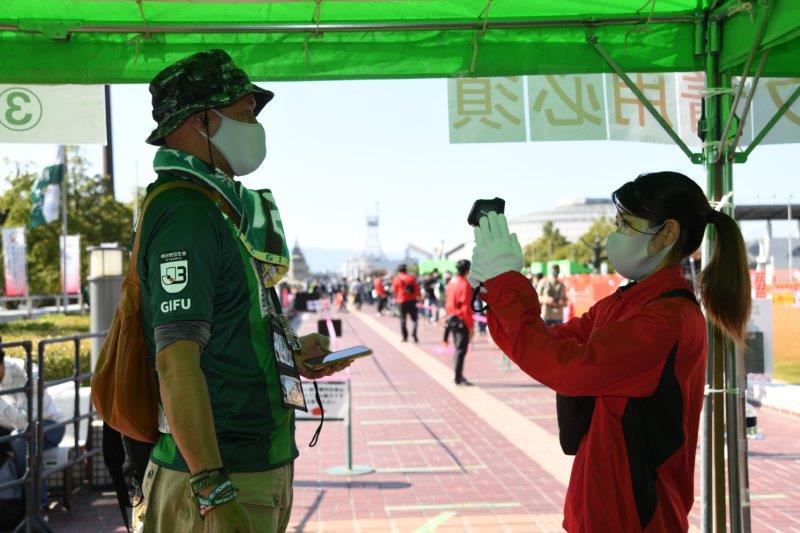 入場ゲートでの手指消毒と検温、社会的距離を保った待機列に、ステージイベントや試合の観戦時は前後左右1m以上空けての配置となっております。