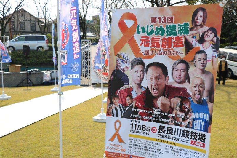 オレンジリボン岐阜ネット主催による児童虐待防止キャンペーンの啓発イベントとして、人文字といじめ撲滅・元気創造プロレスが開催されました。