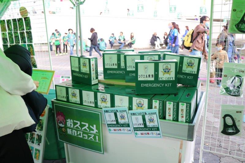 来るべき災害に備えるため、FC岐阜ポンチョやマスクが入ったオリジナルの防災キットを販売しました。