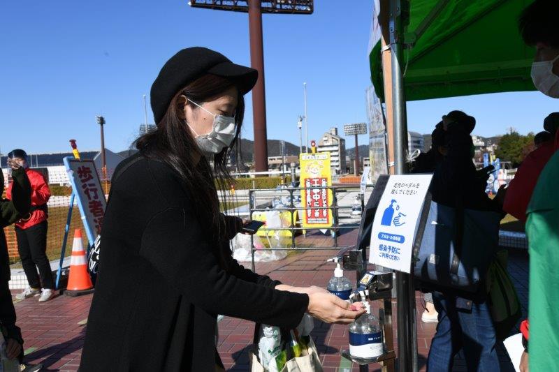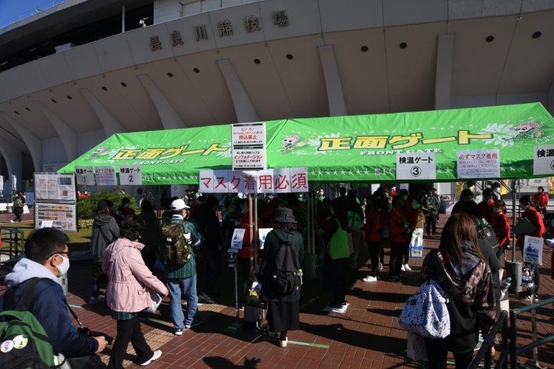 入場ゲートでの手指消毒と検温、社会的距離を保った待機列に、ステージイベントや試合の観戦時は前後左右1m以上空けての配置となっております。
