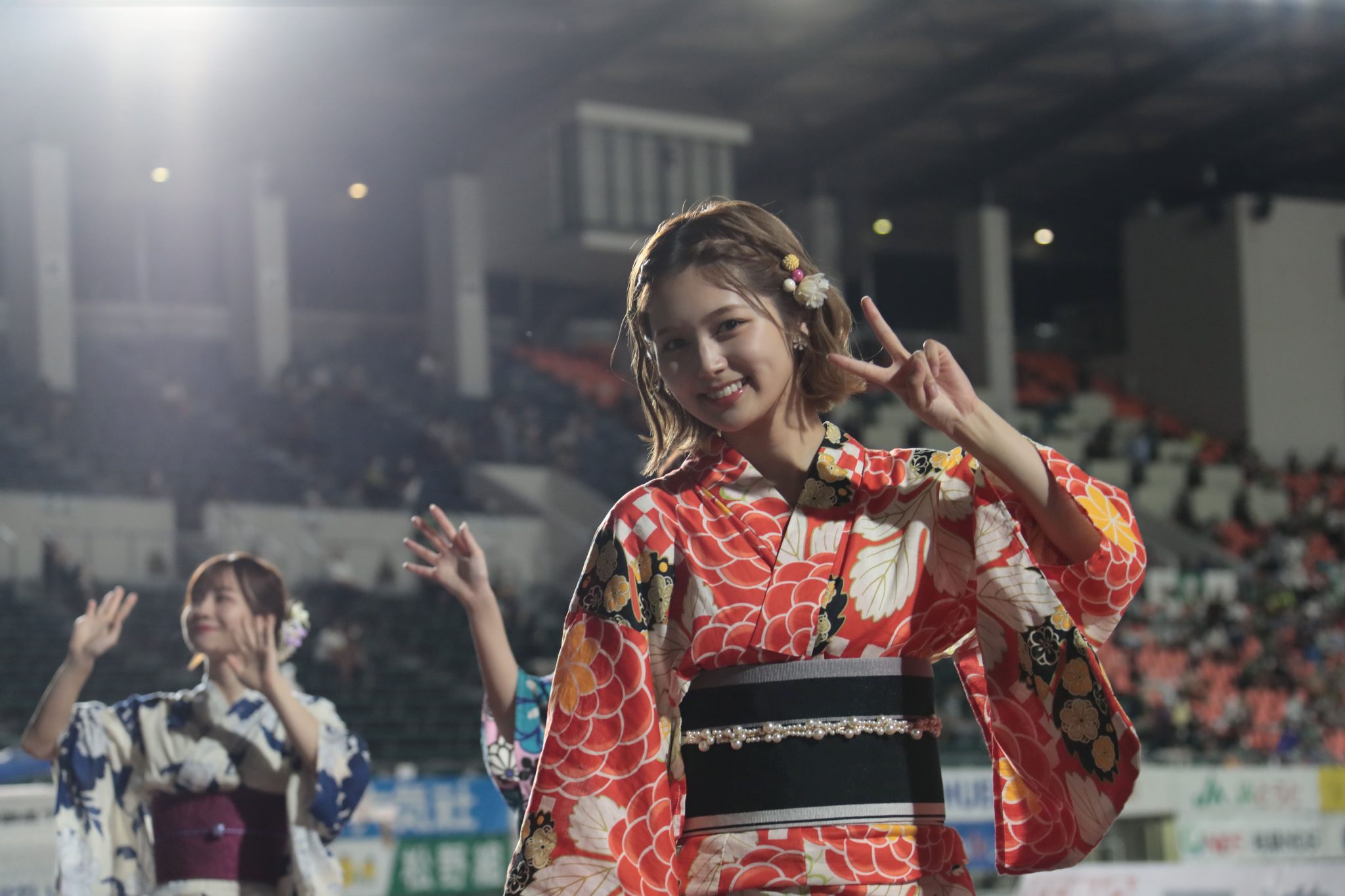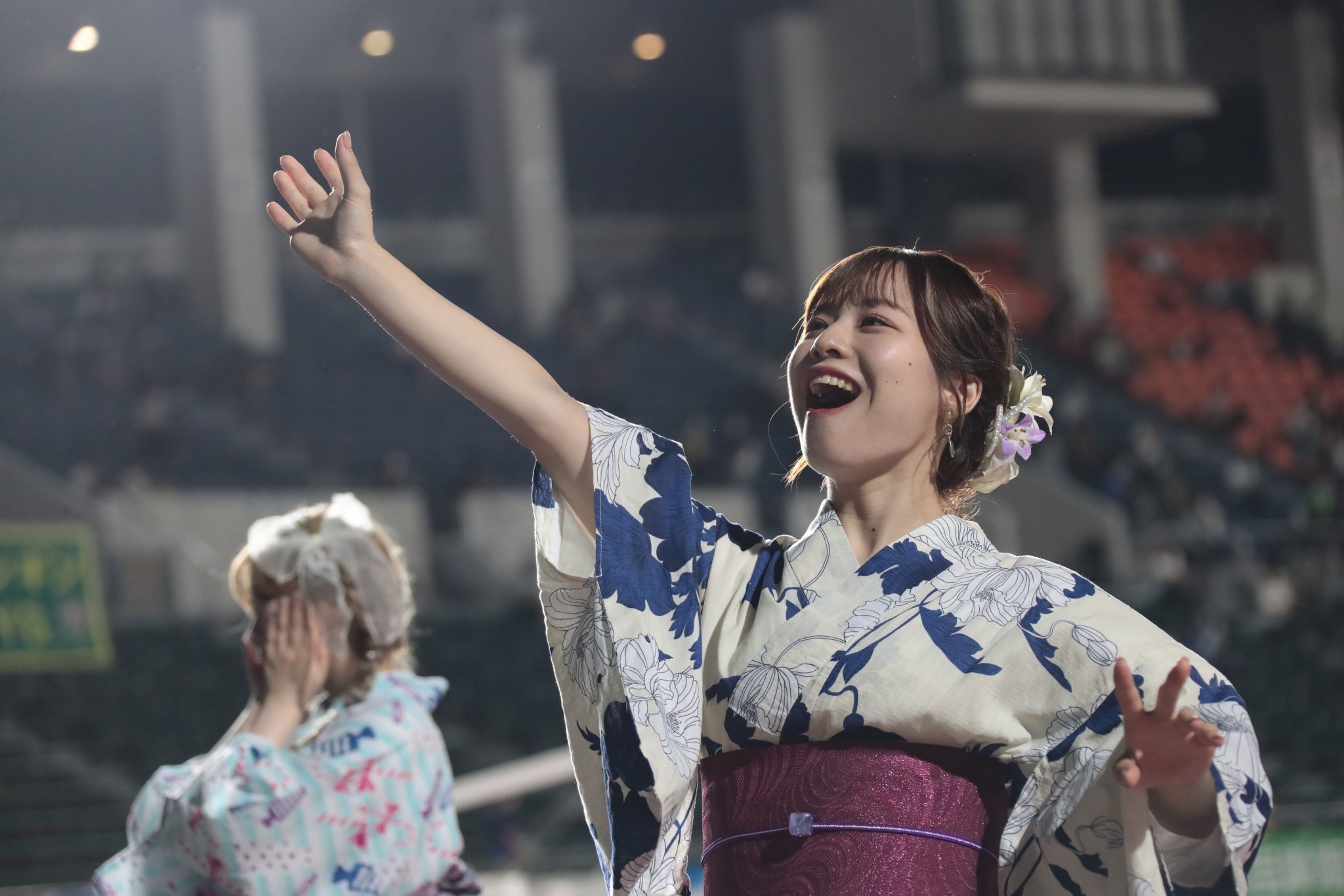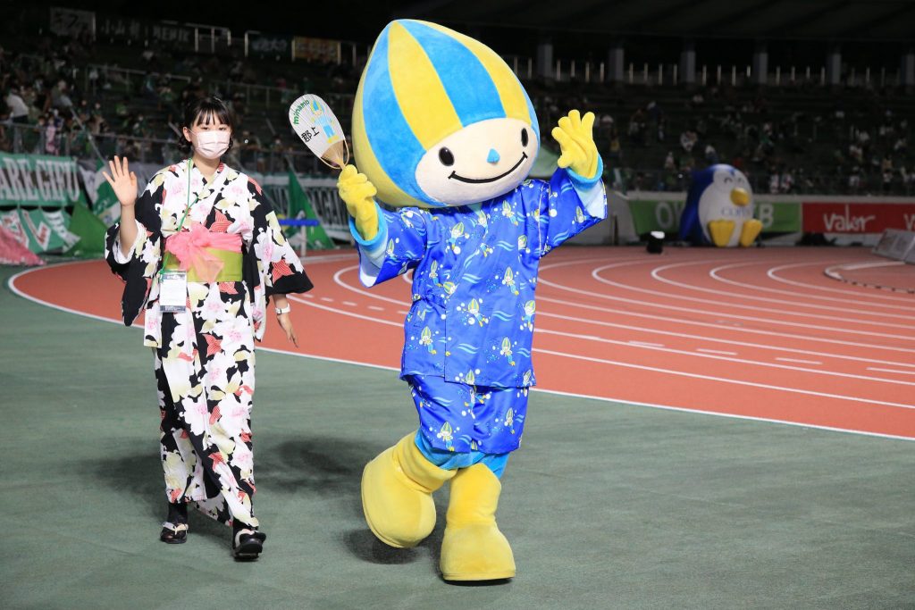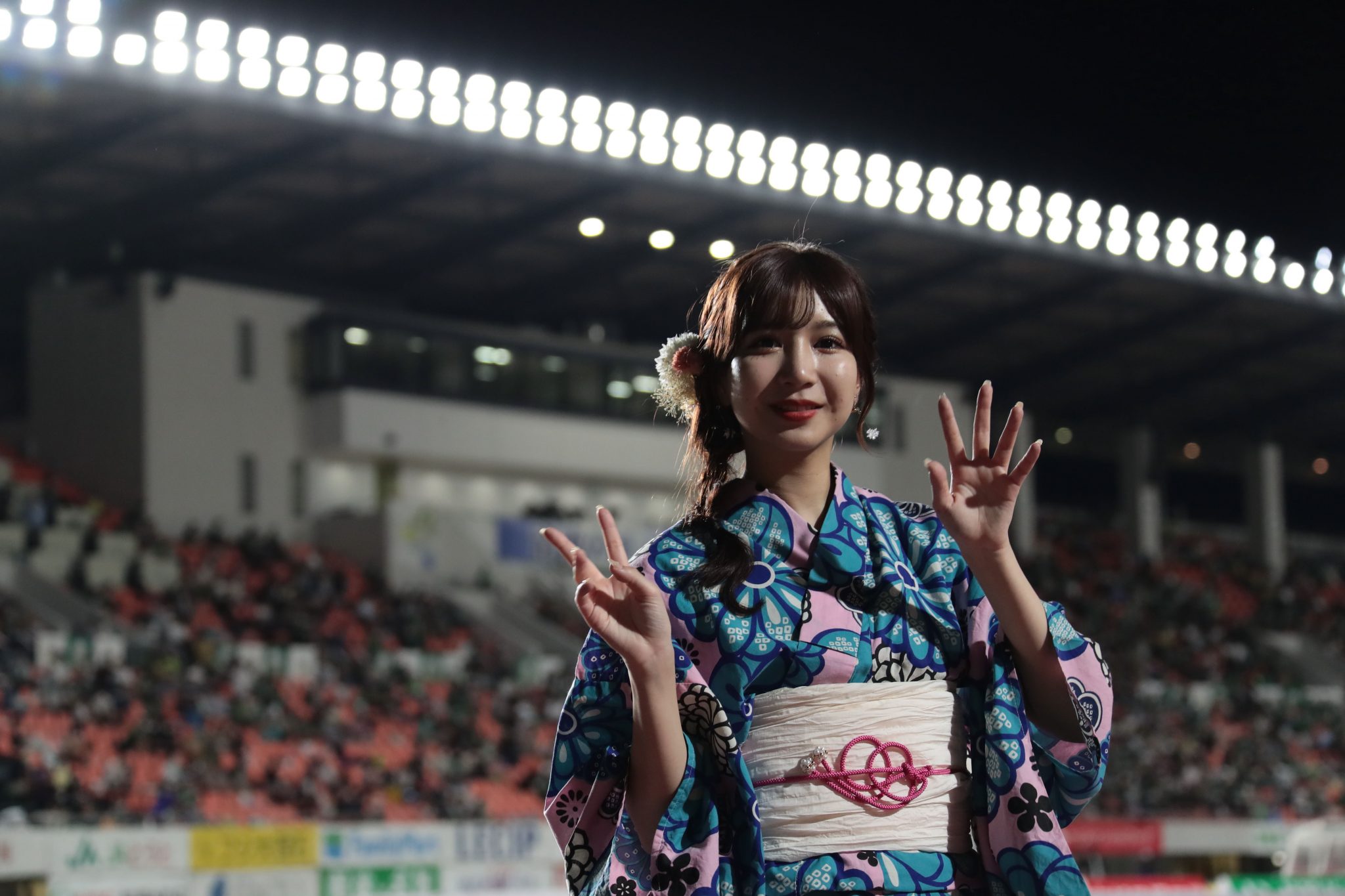 この前のFC岐阜ホームゲームは、チームの努力が勝利という形に繋がる事を願って、#水曜日のカンパネラ(@wed_camp、@utaha_89_id_、@h_kenmochi)さんのエジソンを浴衣姿のGGG(@fcgifuGGG)と踊ったよー