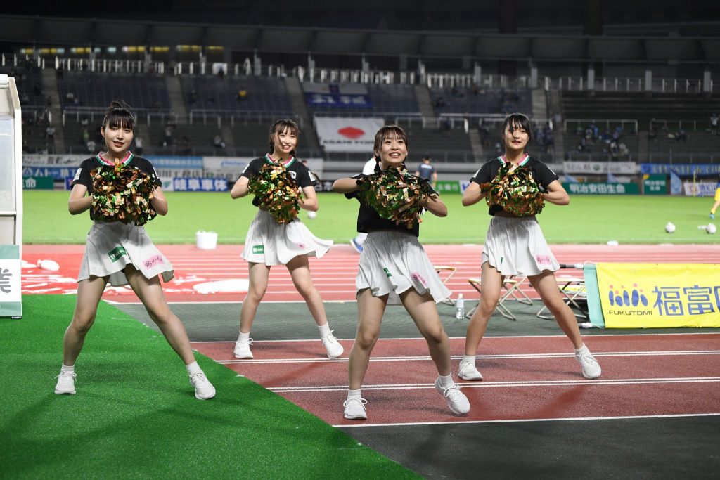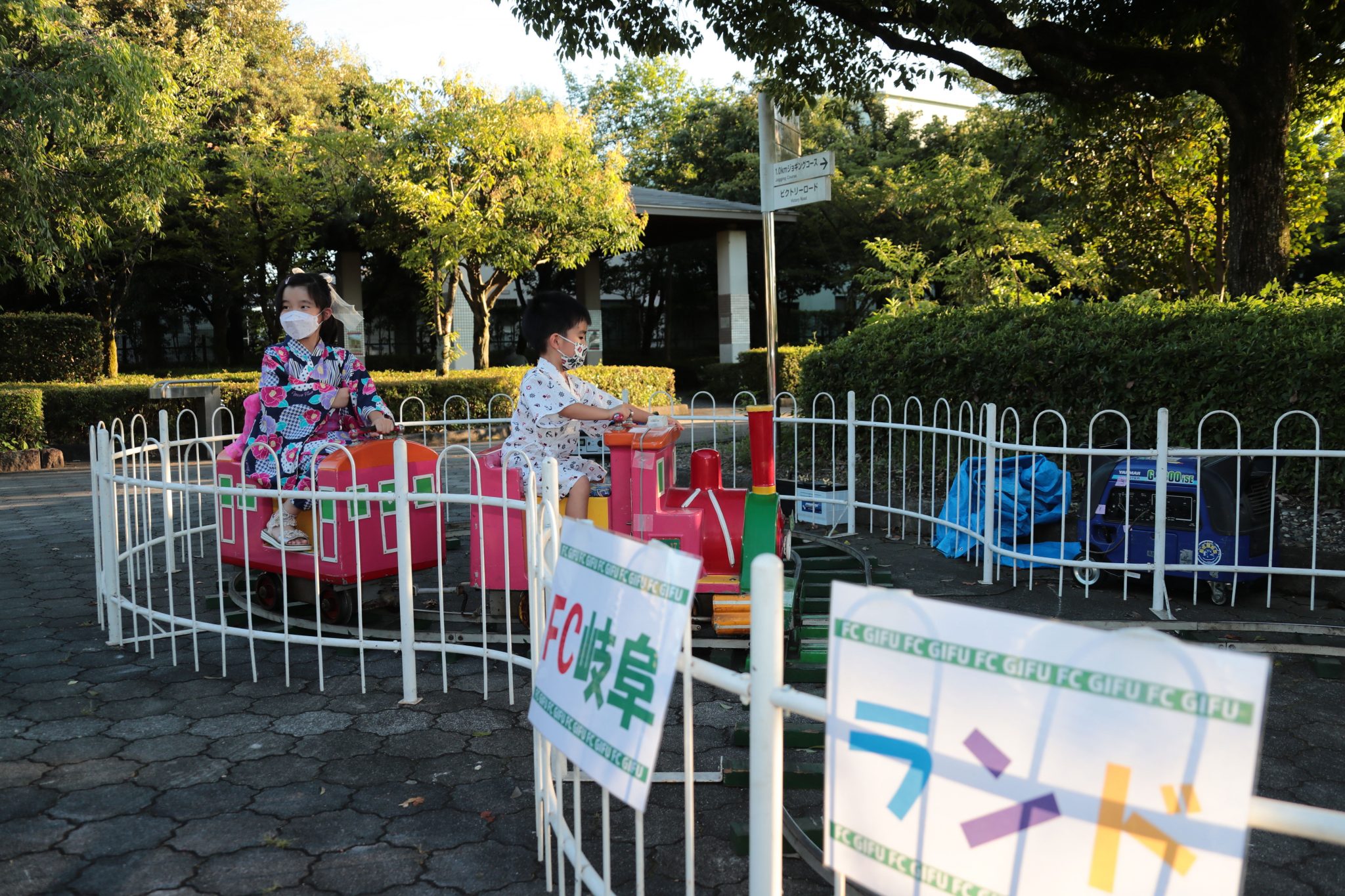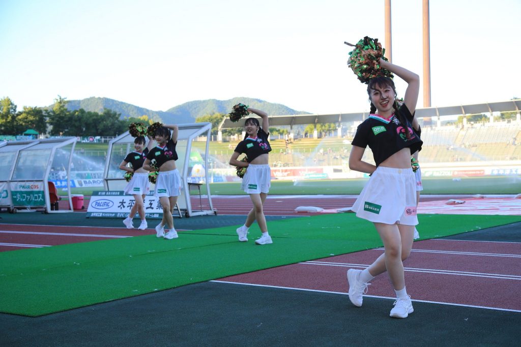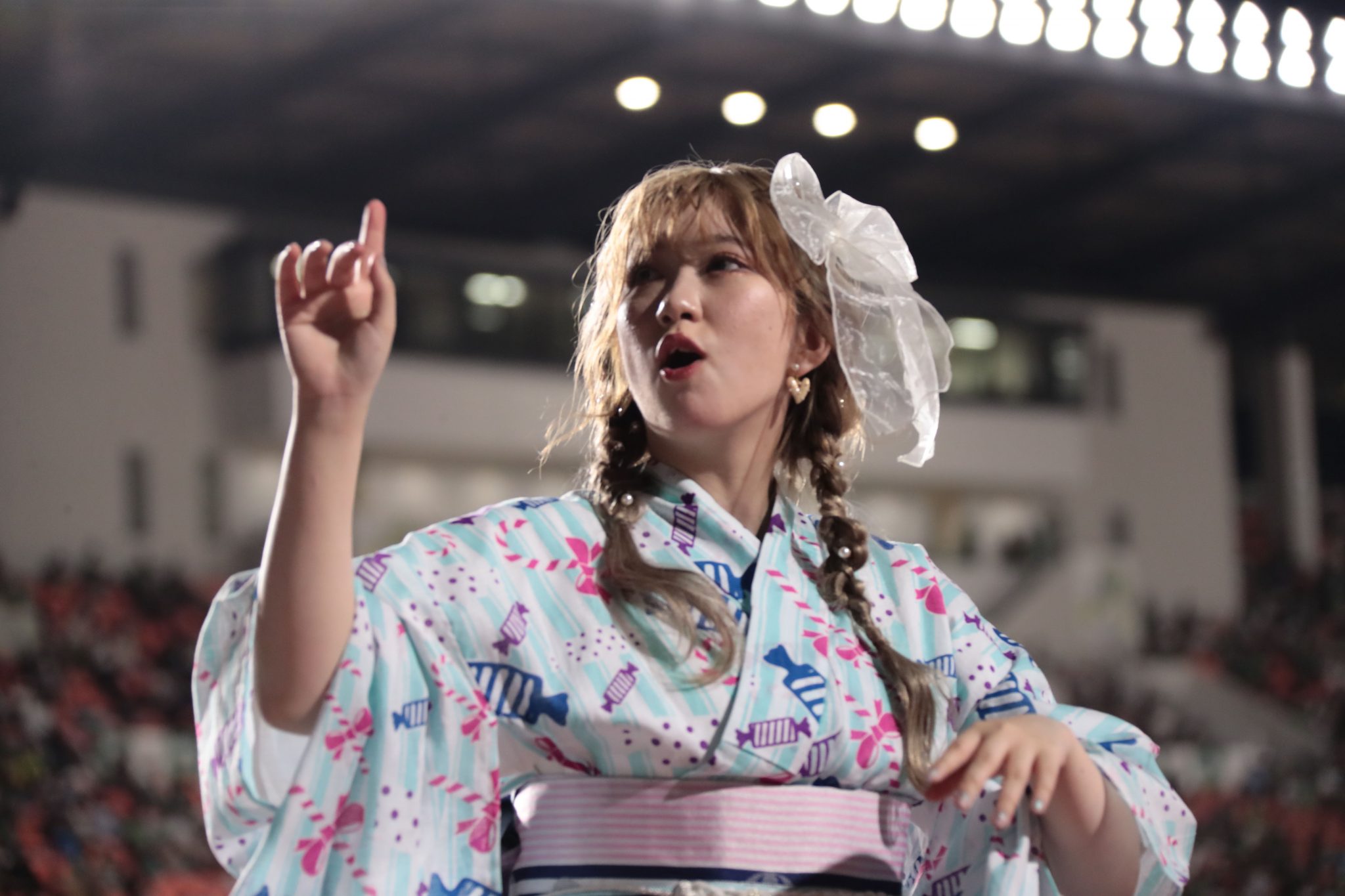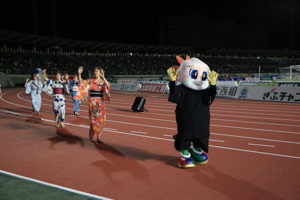 この前のFC岐阜ホームゲームは、チームの努力が勝利という形に繋がる事を願って、#水曜日のカンパネラ(@wed_camp、@utaha_89_id_、@h_kenmochi)さんのエジソンを浴衣姿のGGG(@fcgifuGGG)と踊ったよー