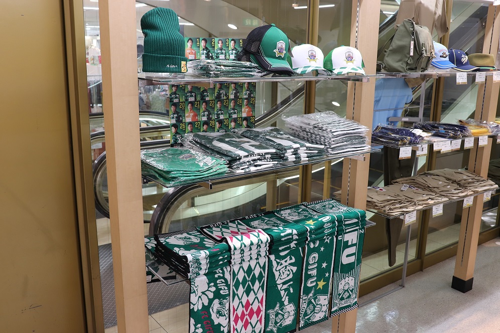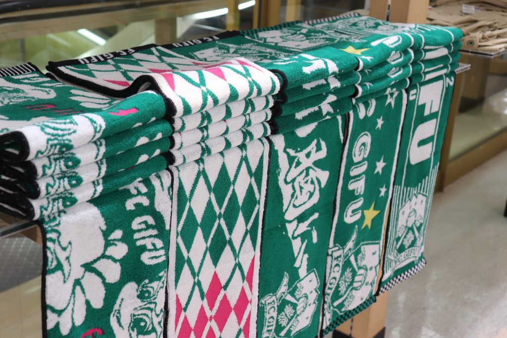 売り場ではタオルマフラーやTシャツ、ストラップなどFC岐阜応援グッズを販売しております。