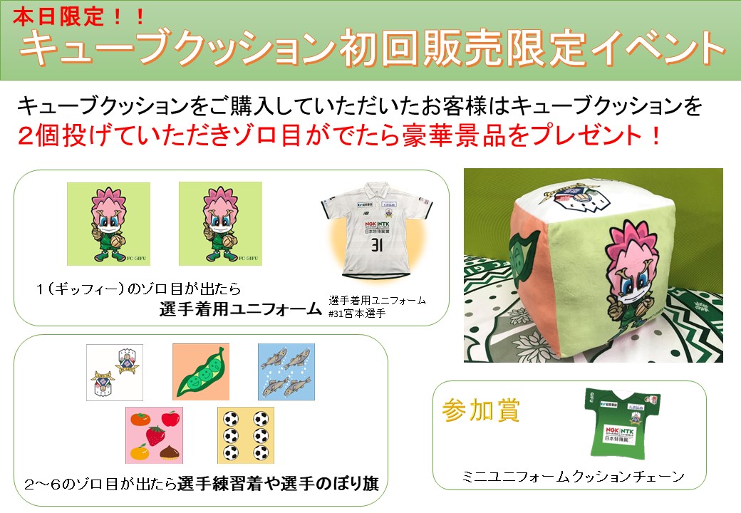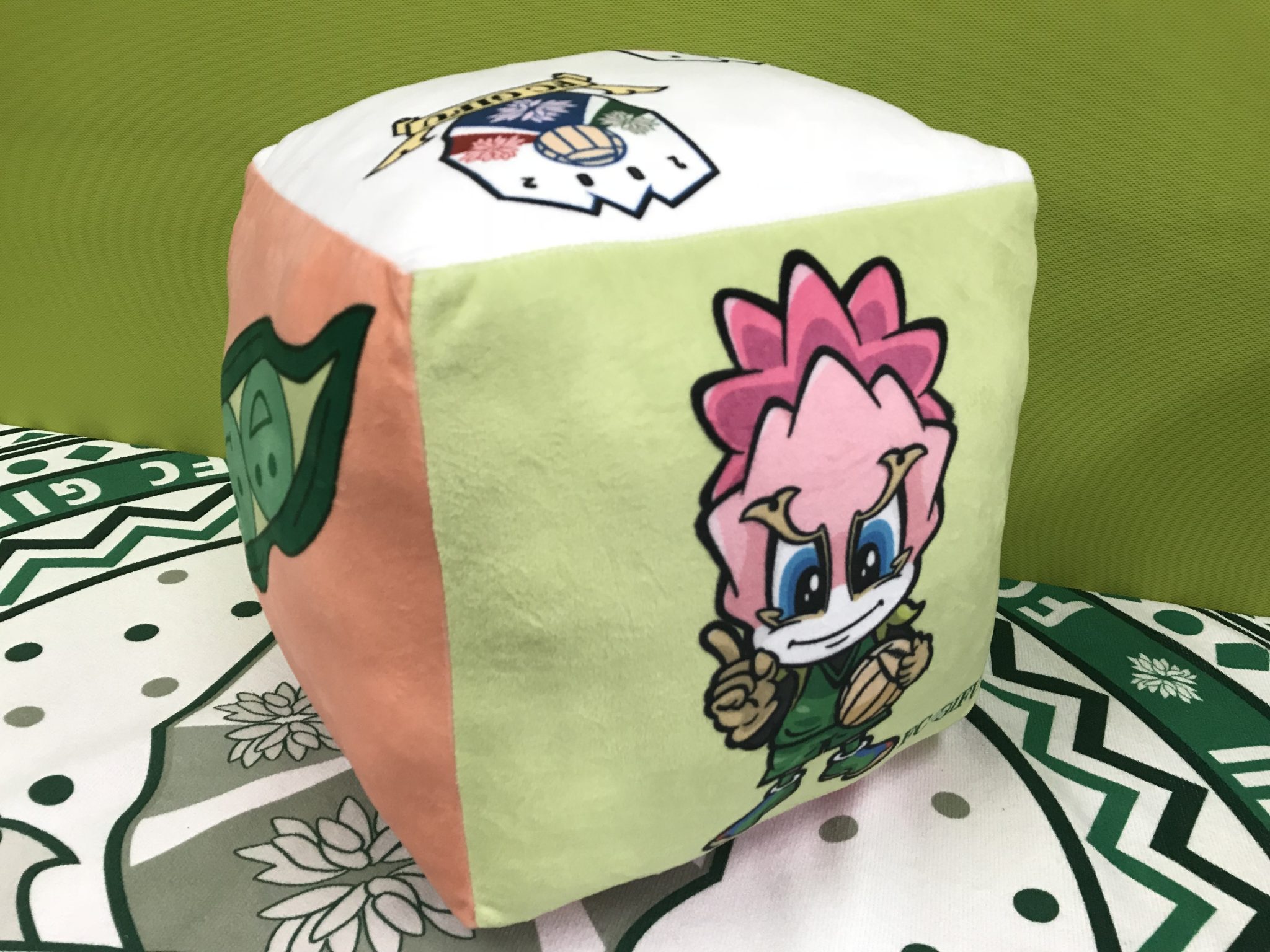 FC岐阜公式マスコットキャラクターの「ギッフィー」やエンブレムがプリントされたキューブ型のクッションが登場!サイコロ仕様なのでお子様のおもちゃやお部屋のインテリアとしてもおすすめです!