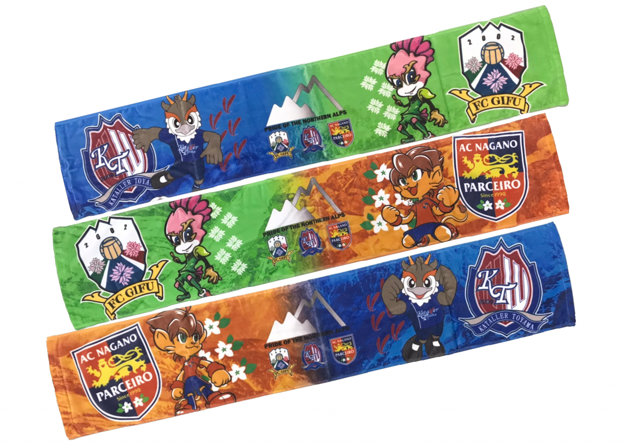 ライカくん・ライオ―・ギッフィーがコラボした限定タオルマフラー!3本組み合わせると北アルプスの山々が背景に浮かび上がるデザインとなっています。