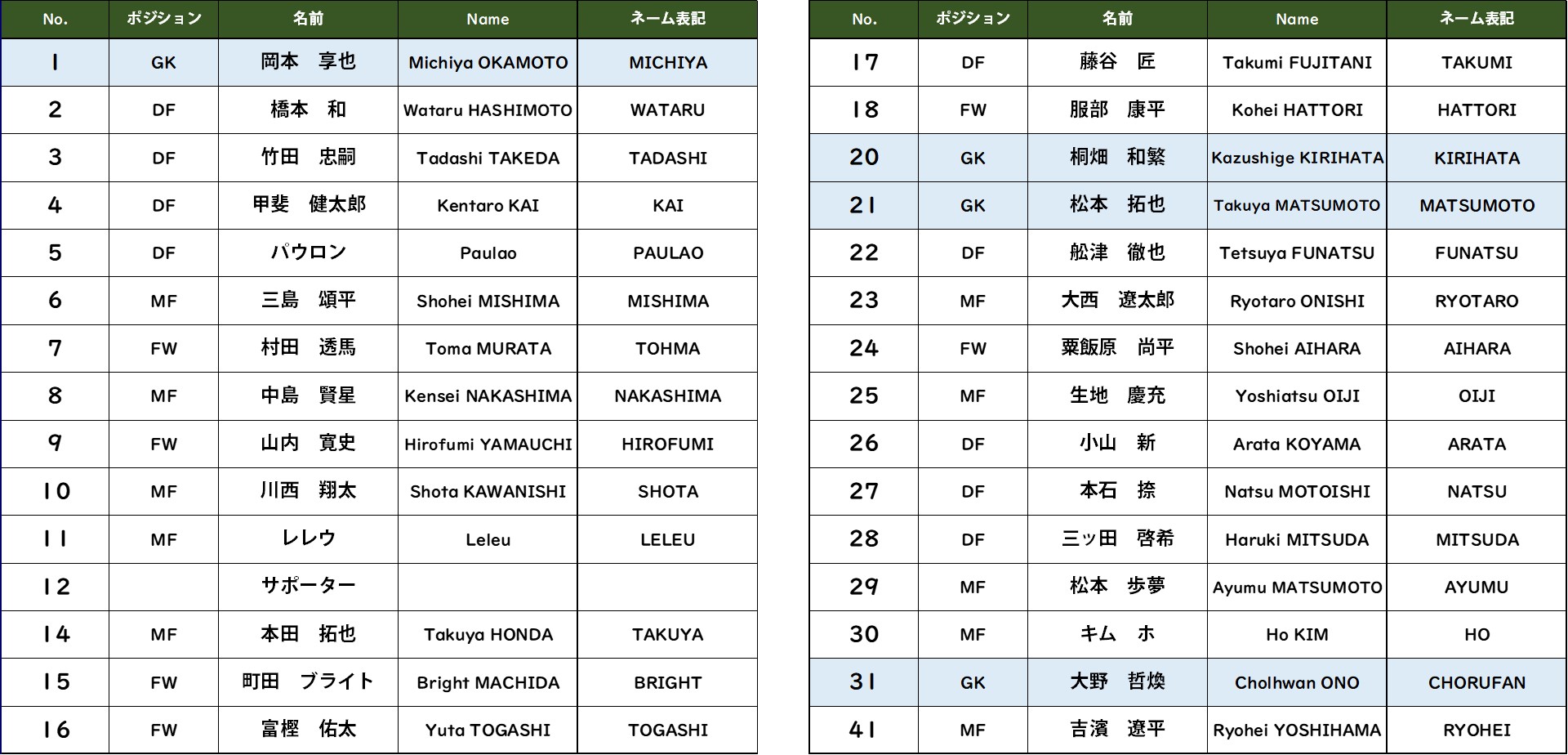 ■選手使用番号・ネーム