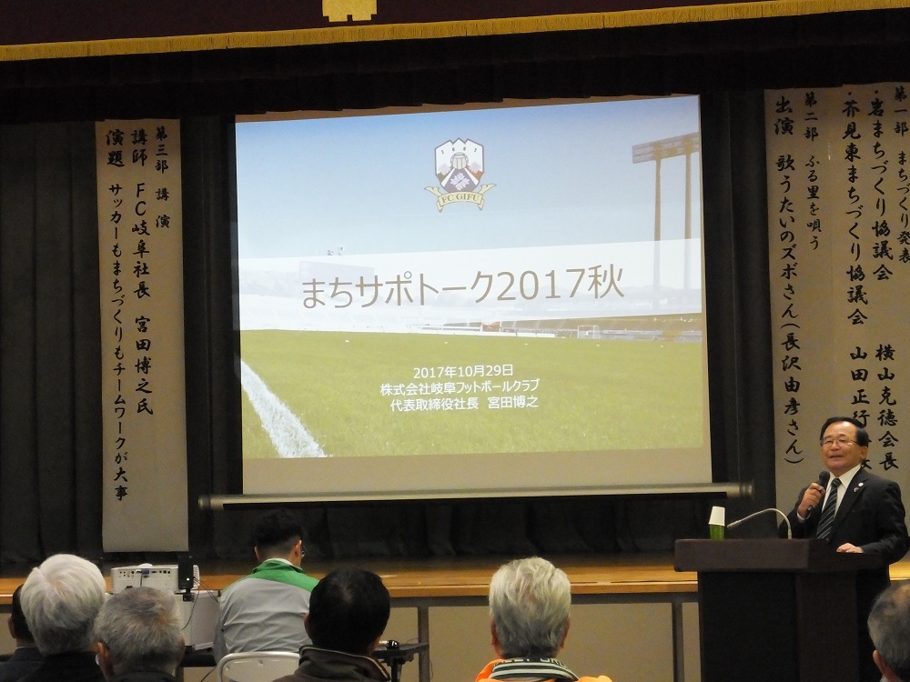 FC岐阜が地域のまちづくり、ひとづくりにご協力できることとして「地域の自治会単位でのイベントやお祭りへ参加して盛り上げに協力したり、サッカー教室やかけっこ教室を開催し地域の健康づくりをお手伝いさせていただくことができる」と紹介させていただき、「自治会、地域のコミュニケーションアップにぜひFC岐阜を活用してほしい」とみなさまに呼びかけました。