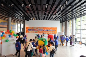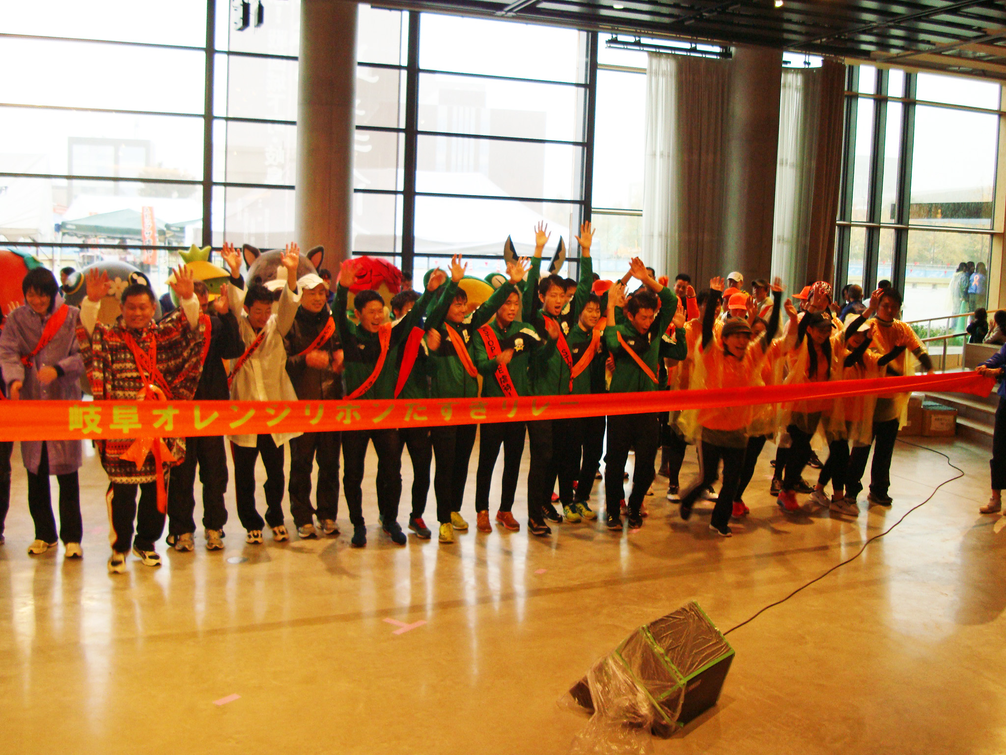 30分ほどかけて市内を走り、ぎふメディアコスモスに到着してゴールイベントに参加しました。県内各地からオレンジのたすきが繋がれ、ゴールに集まりました。