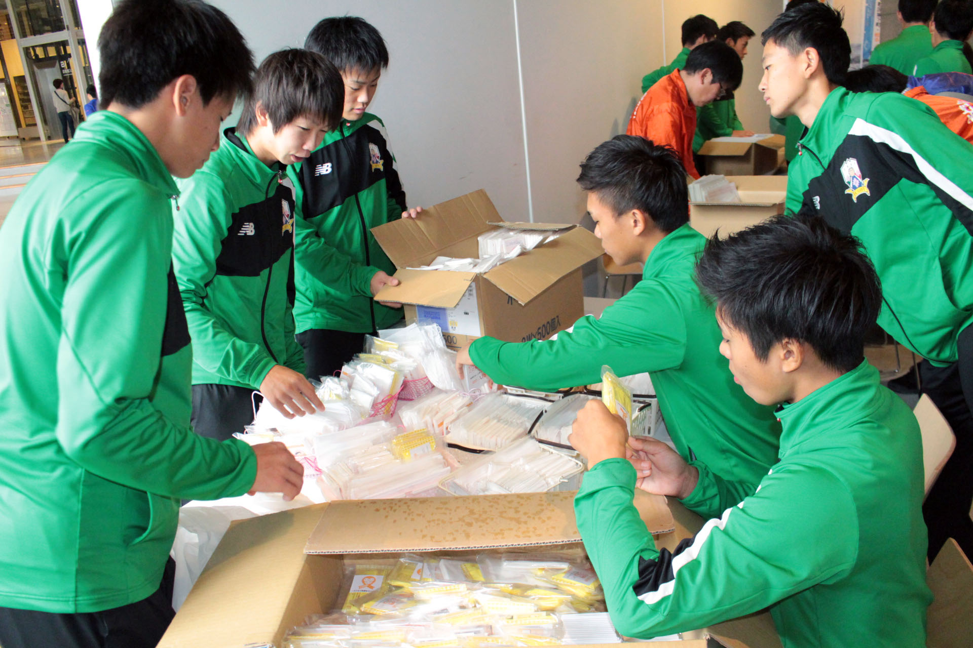 あいにくの雨となりましたが、朝からぎふメディアコスモスの会場設営などをユースの選手がお手伝いさせて頂きました。イベントで配布するノベリティなども手分けして準備し、10時からの啓発イベントが開始となりました。