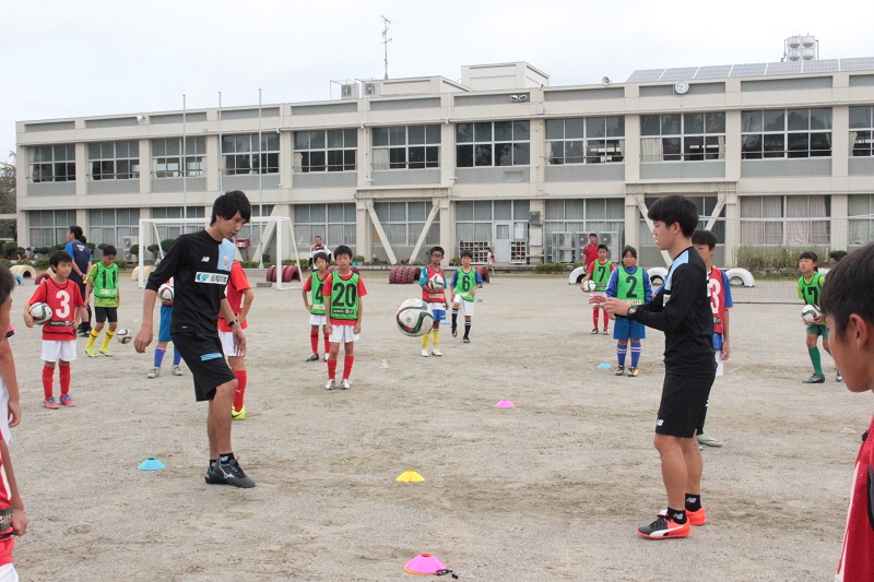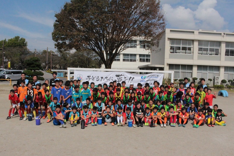 FC岐阜では那加第二小学校でサッカー教室を実施。各務原市内の少年団に所属する小学校5,6年生98名と、サッカー体験に訪れた小学校1年生から5年生29名が参加しました。