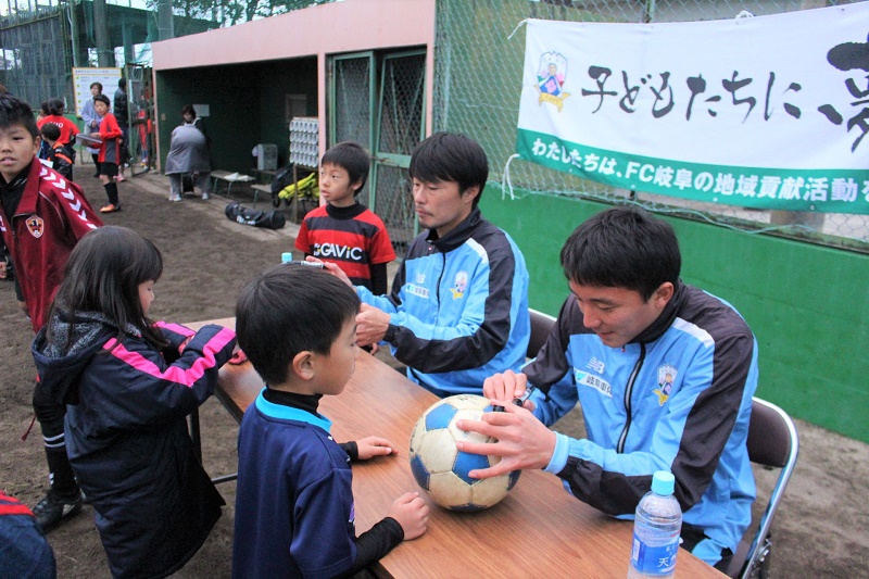 FC岐阜トップチームの田森大己選手、磐瀬剛選手の2名と、スクールコーチが指導を行いました。
