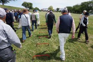 次に、正しい歩き方を学び、ミニハードルを使った正しい歩幅の確認もしました。