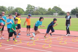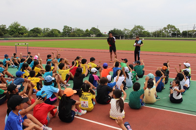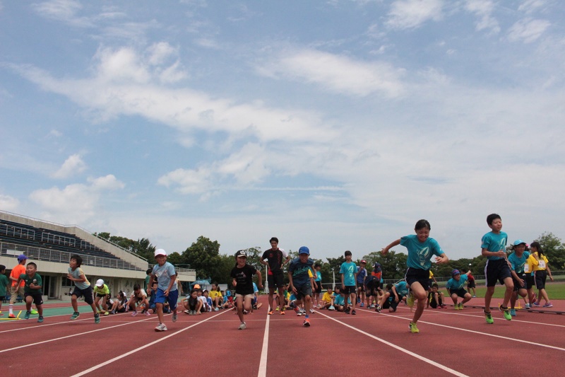 「全てのスポーツに通じる運動能力は走ることから」ということで、陸上競技に限定せず、事前募集で集まった約90人の小学生がサッカーなど他のスポーツにも役立つ「速くなるコツ」を学びました。