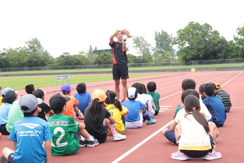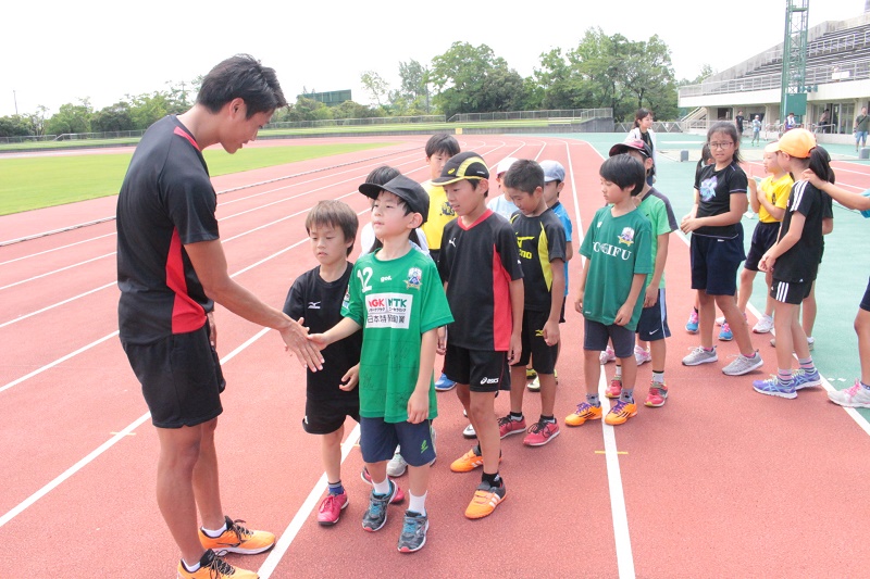 7月17日(月・祝)大垣市にある浅中公園陸上競技場にて、和戸達哉選手(陸上:紀の国わかやま国体110mH1位)をお迎えし、FC岐阜かけっこ教室を開催しました。