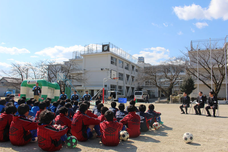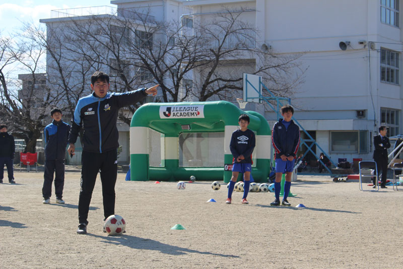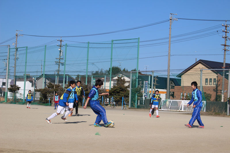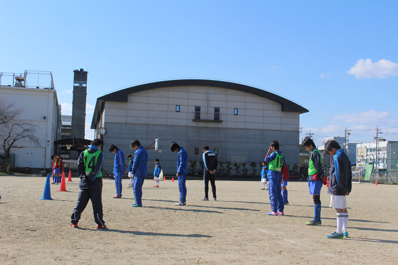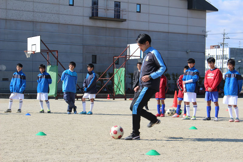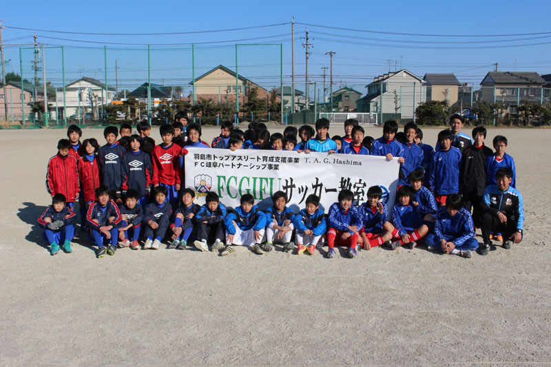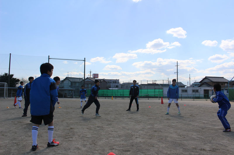 3月11日(土)羽島市竹鼻中学校グラウンドで、FC岐阜サッカー教室が開催されました。今回のサッカー教室は、羽島市トップアスリート育成支援事業の一環として行われ、市内の中学校サッカー部(羽島中、竹鼻中、中央中)の選手などが集まり、行われました。FC岐阜からは、皆川コーチ、島田コーチに加え、スペシャルコーチとして益山コーチが参加しました。