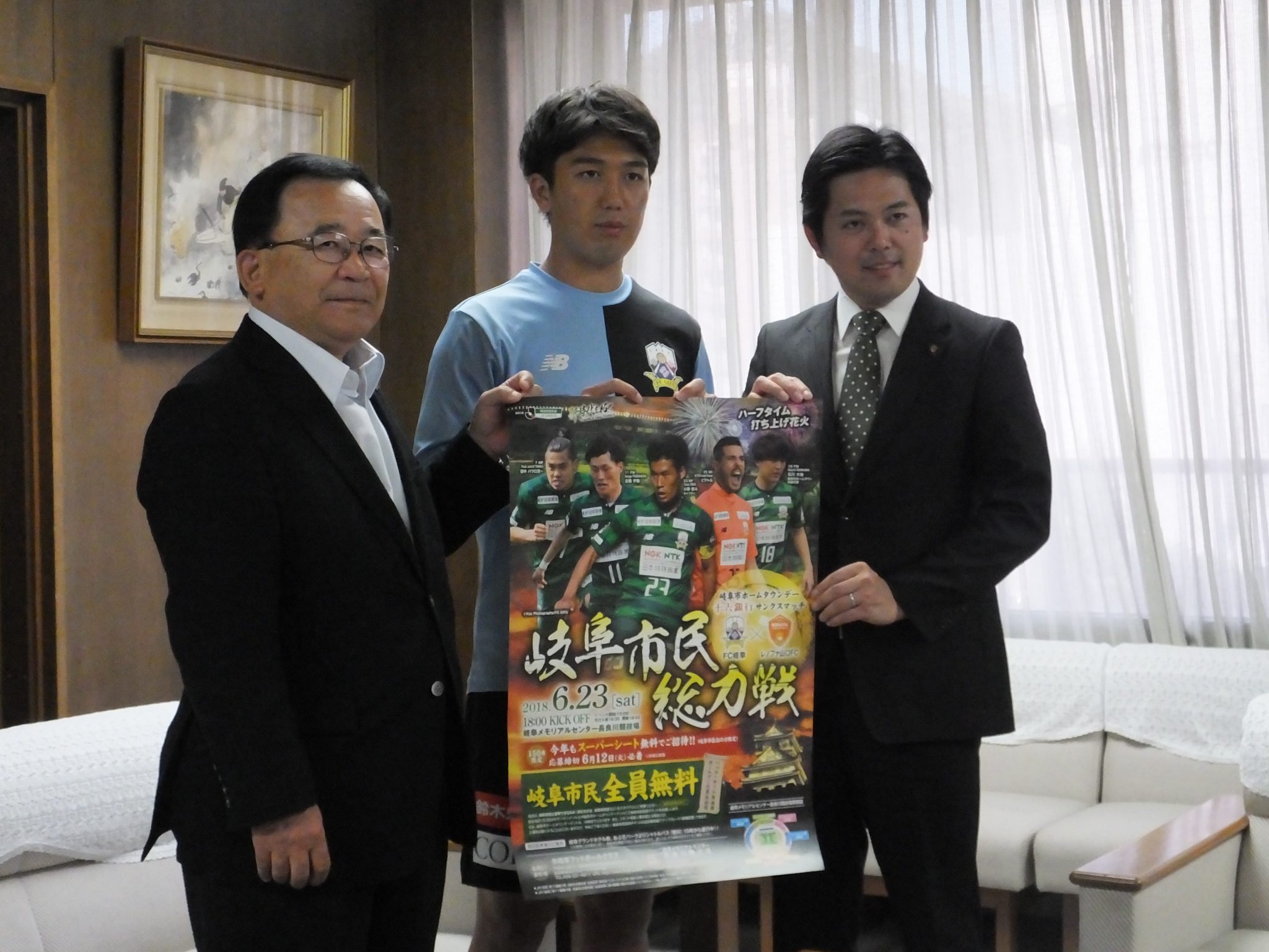 6月23日(土)レノファ山口FC戦(18時キックオフ) の「岐阜市ホームタウンデー」開催にあたり、6月12日(火)岐阜市役所にて、岐阜市ホームタウン応援大使である石川大地選手と宮田博之社長が柴橋正直市長を表敬訪問させて頂きました。