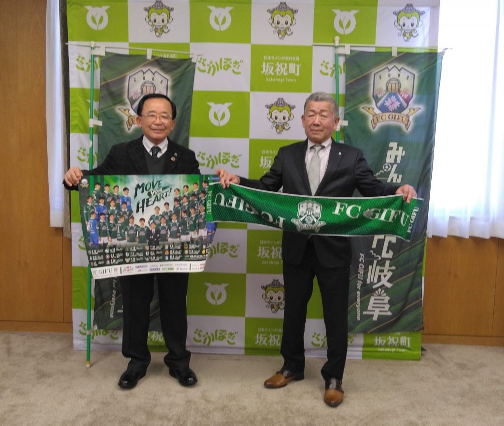 3月18日(土)鹿児島ユナイテッドFC戦の「坂祝町ホームタウンデー」開催にあたり、2月17日(金)坂祝町役場にて、宮田 博之 会長が、柴山 佳也 坂祝町長を訪問させていただきました。