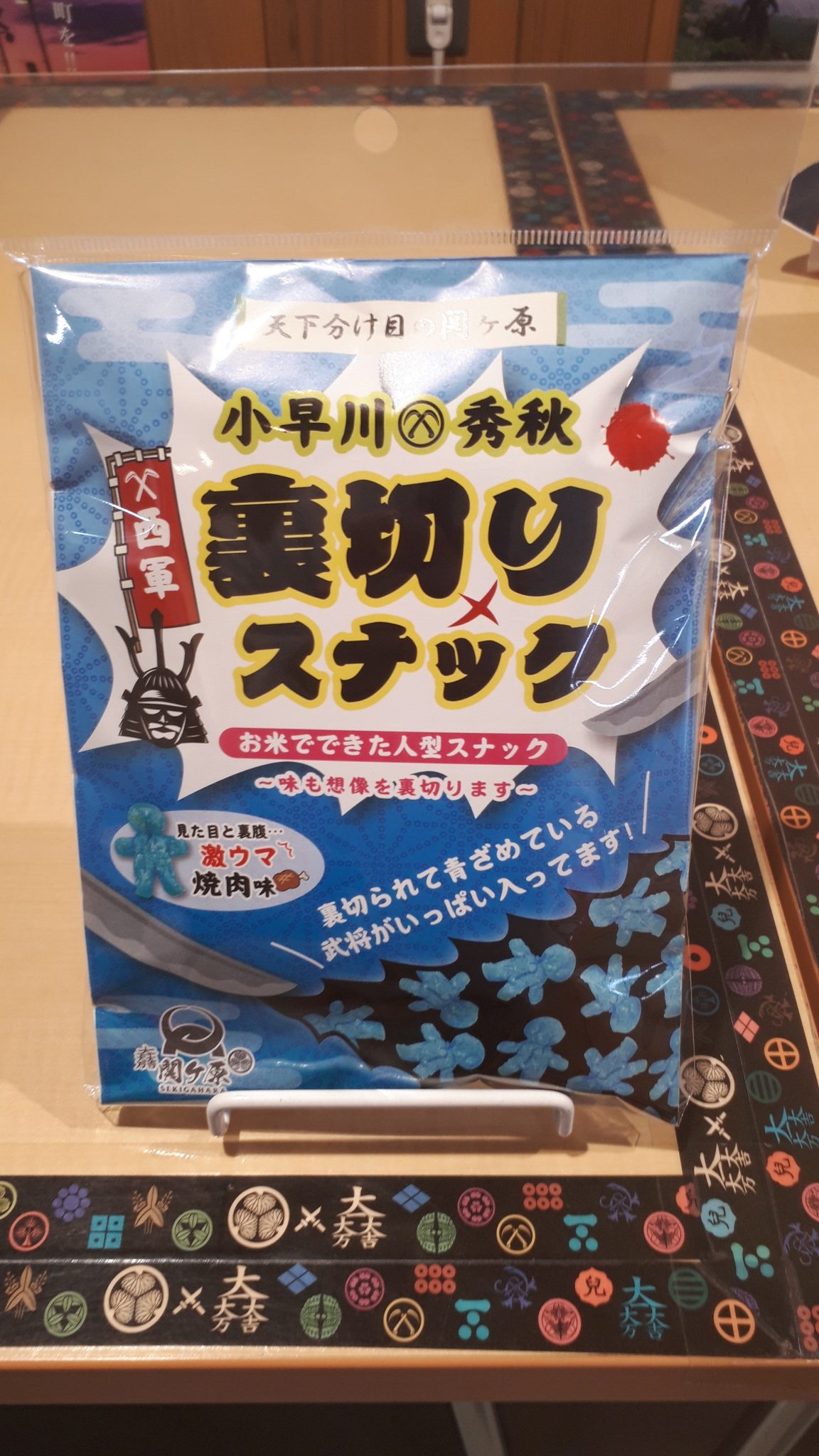 (写真、関ケ原町特産ブースにて、うらぎりサイダーや裏切りスナックなどを販売いたします)