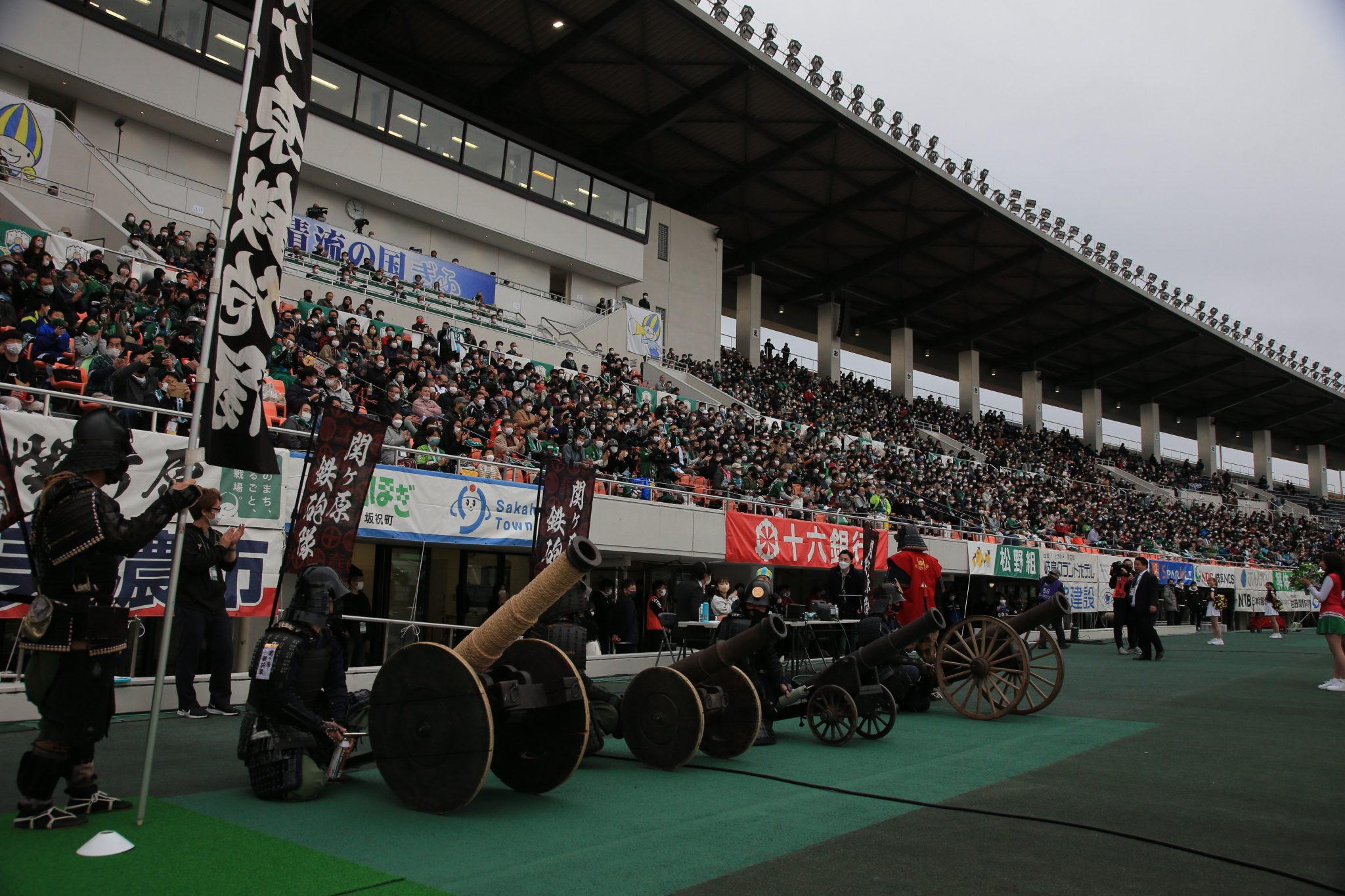 関ケ原町ホームタウンデーとして、関ケ原観光協会様による物産ブースや甲冑体験ブースを出店いただく他、関ケ原町提供の「せ木がはらコースター」、「武将家紋入りハンドタオル」など、関ケ原合戦の地ならではの来場者プレゼントをご提供していただきます。そして今年も関ケ原鉄砲隊の皆さんにご来場いただき、4門の大砲を使いホーム開幕戦祝砲カウントダウンを行っていただけるなど、様々な盛り上げ策を講じていただけることに御礼申し上げました。