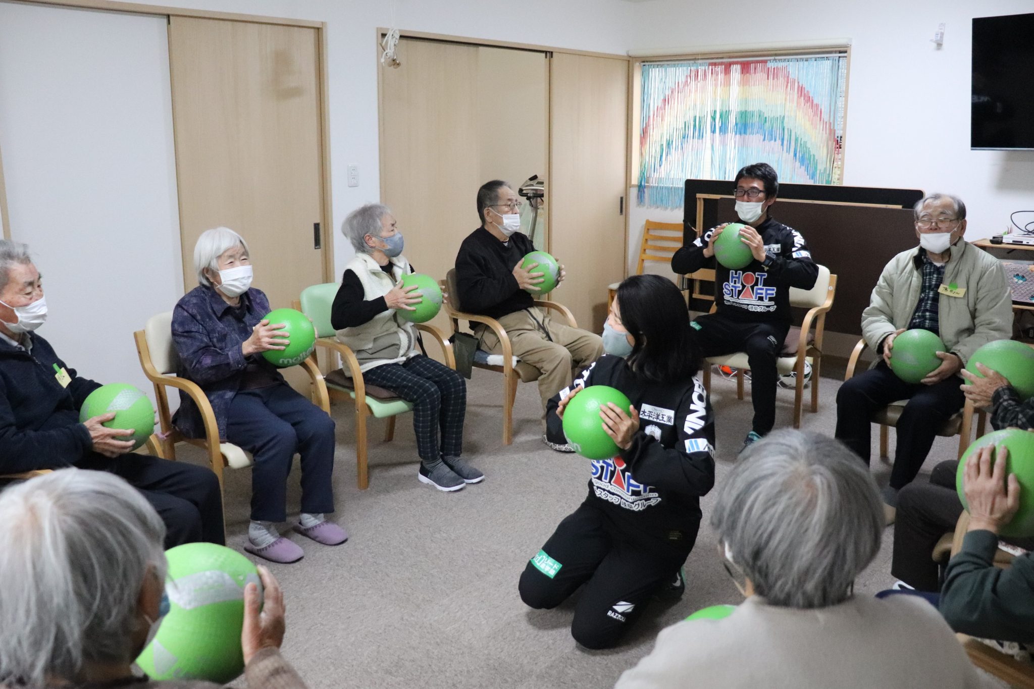FC岐阜のスタッフが、各施設利用者の身体状況に合わせた楽しい体操メニューを実施していきます。