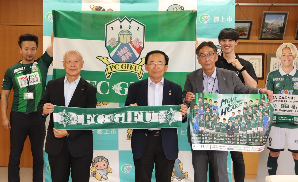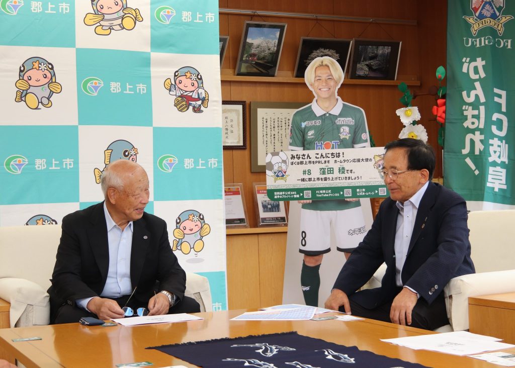 7月2日(日)のJ3リーグ第16節、ホームスタジアムでの いわてグルージャ盛岡戦の「郡上市ホームタウンデー」開催にあたり、6月8日(木)郡上市役所にて、宮田 博之 会長が、日置 敏明 郡上市長を表敬訪問いたしました。