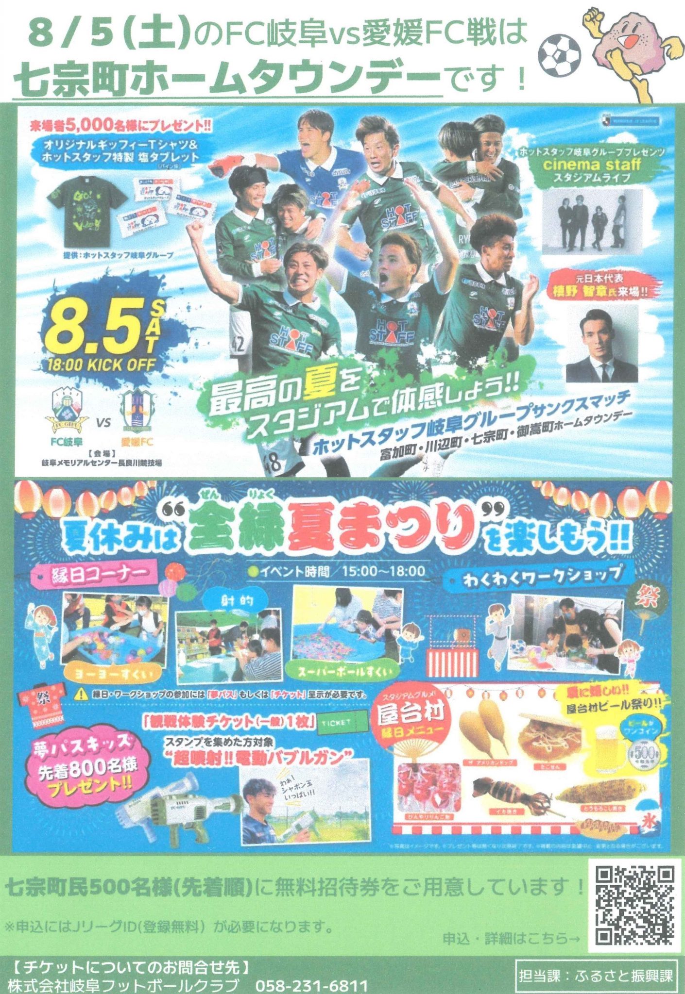 8月5日(土)OKB大垣共立銀行サンクスマッチ愛媛FC戦の「七宗町ホームタウンデー」では、七宗町在住の方500名様、七宗町商工会の所属会員200名様を無料でご招待いたします。ぜひ多くの方にスタジアムにご来場いただきまして、チーム・選手を応援していただければ幸いです。