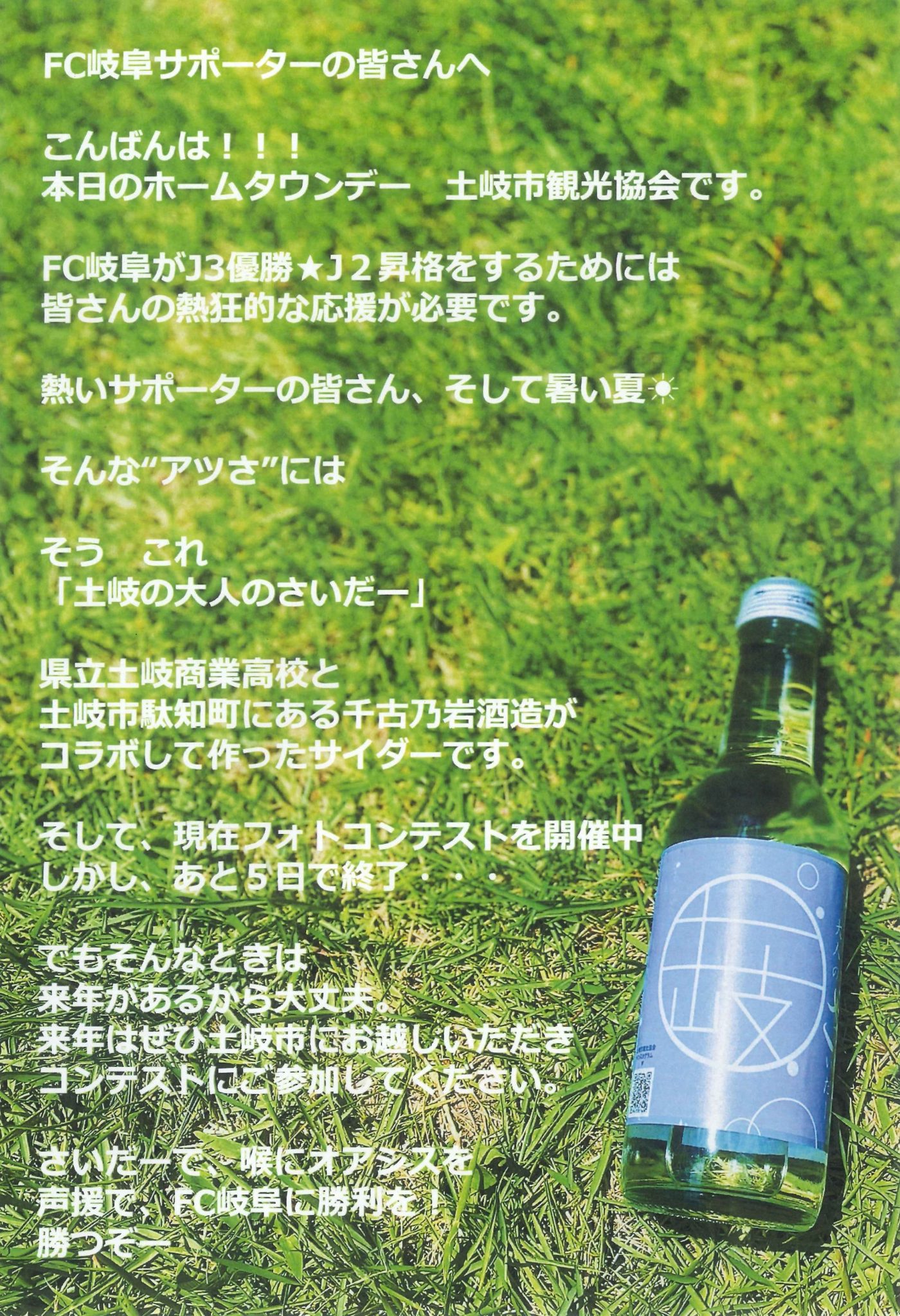 8月26日(土)OKB大垣共立銀行サンクスマッチ ガイナーレ鳥取戦の「土岐市ホームタウンデー」では、土岐市在住の方500名様、土岐商工会議所の所属会員200名様を無料でご招待いたします。ぜひ多くの方にスタジアムにご来場いただきまして、FC岐阜を応援していただければ幸いです。