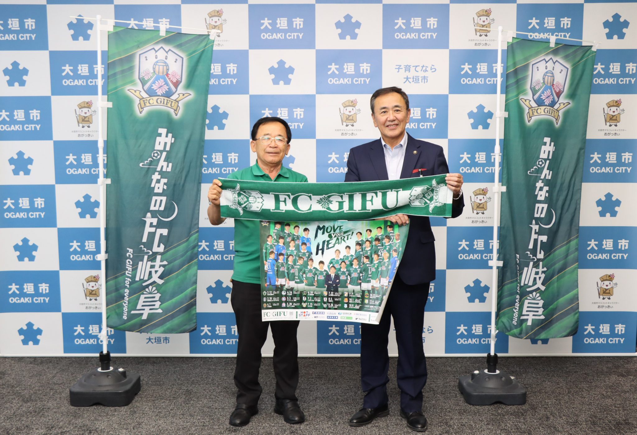 8月26日(土)J3リーグ第24節、ガイナーレ鳥取戦の「大垣市ホームタウンデー」開催にあたり、8月4日(金)大垣市役所にて、宮田 博之 会長が、石田 仁 大垣市長を表敬訪問いたしました。