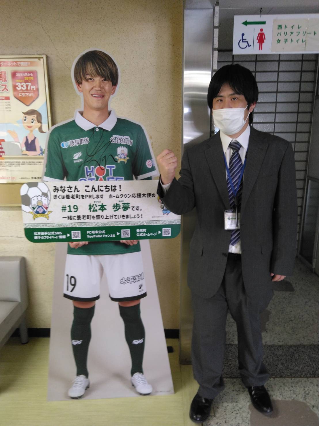 さらに、県内42市町村ではそれぞれの応援大使の等身大パネルが皆様をお出迎えしています。パネルには各市町村のホームページと応援大使を務める選手個人のSNS、FC岐阜公式YouTubeにアクセスできるQRコードがついていますので、是非ご覧ください。