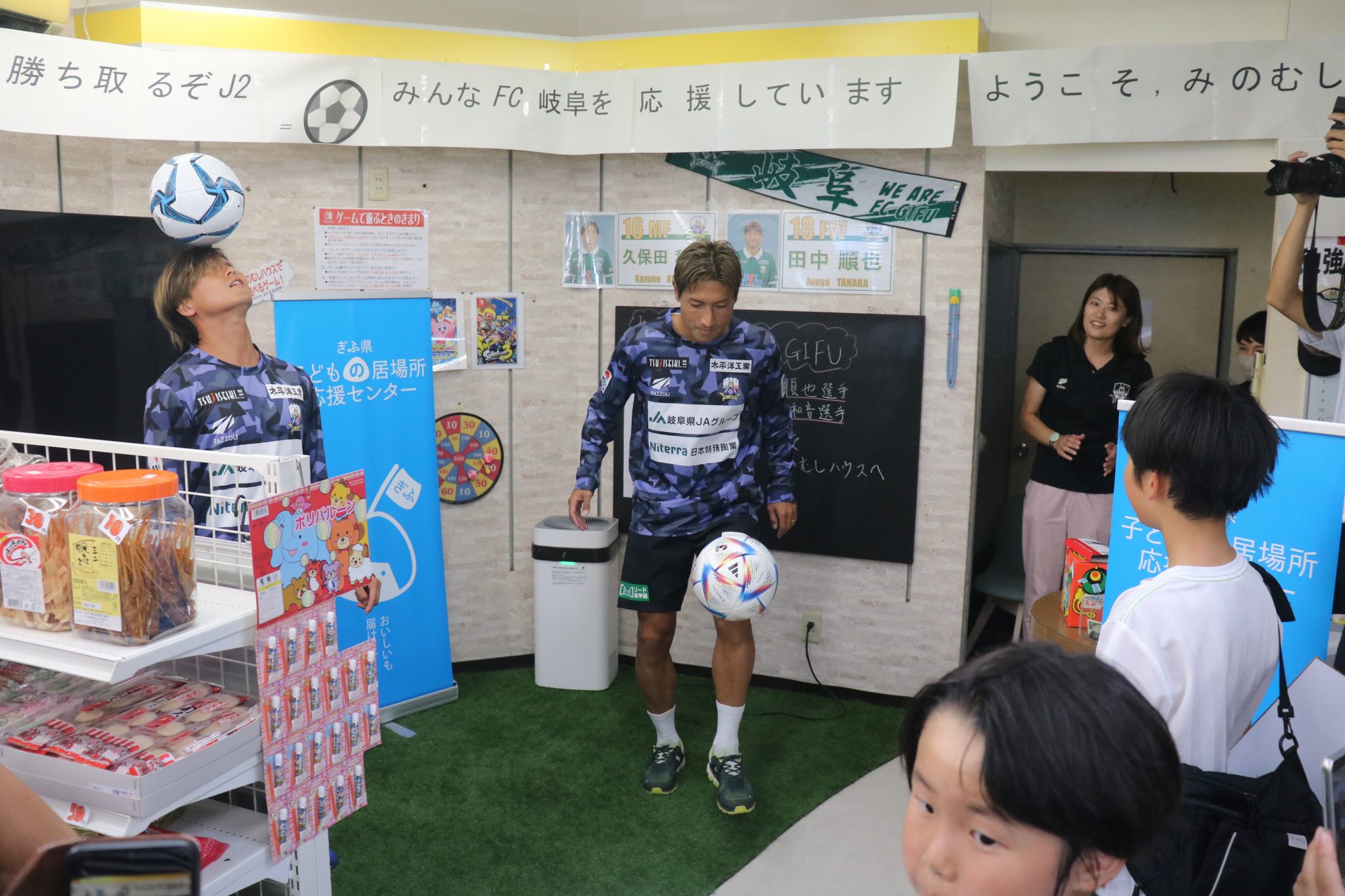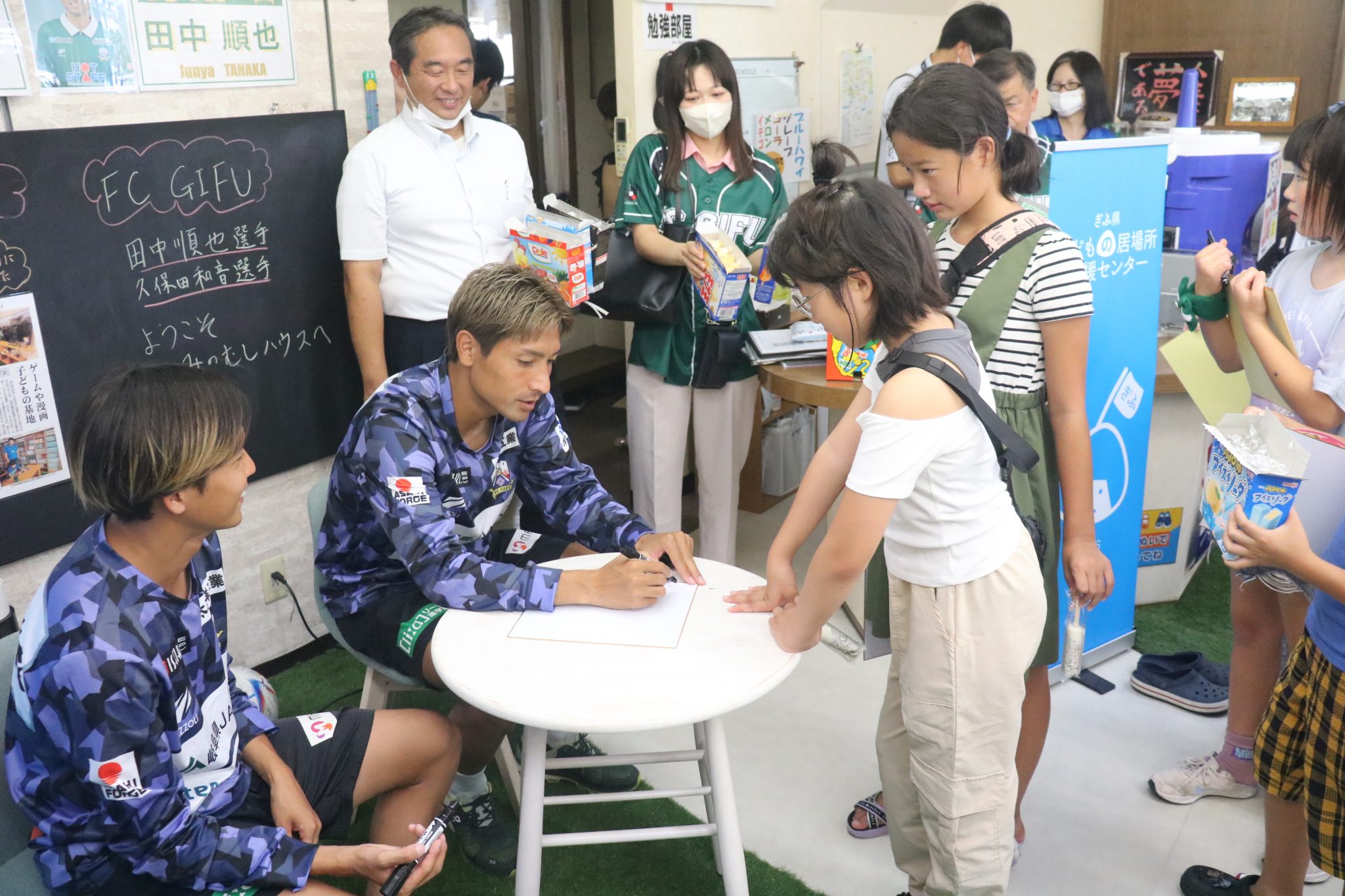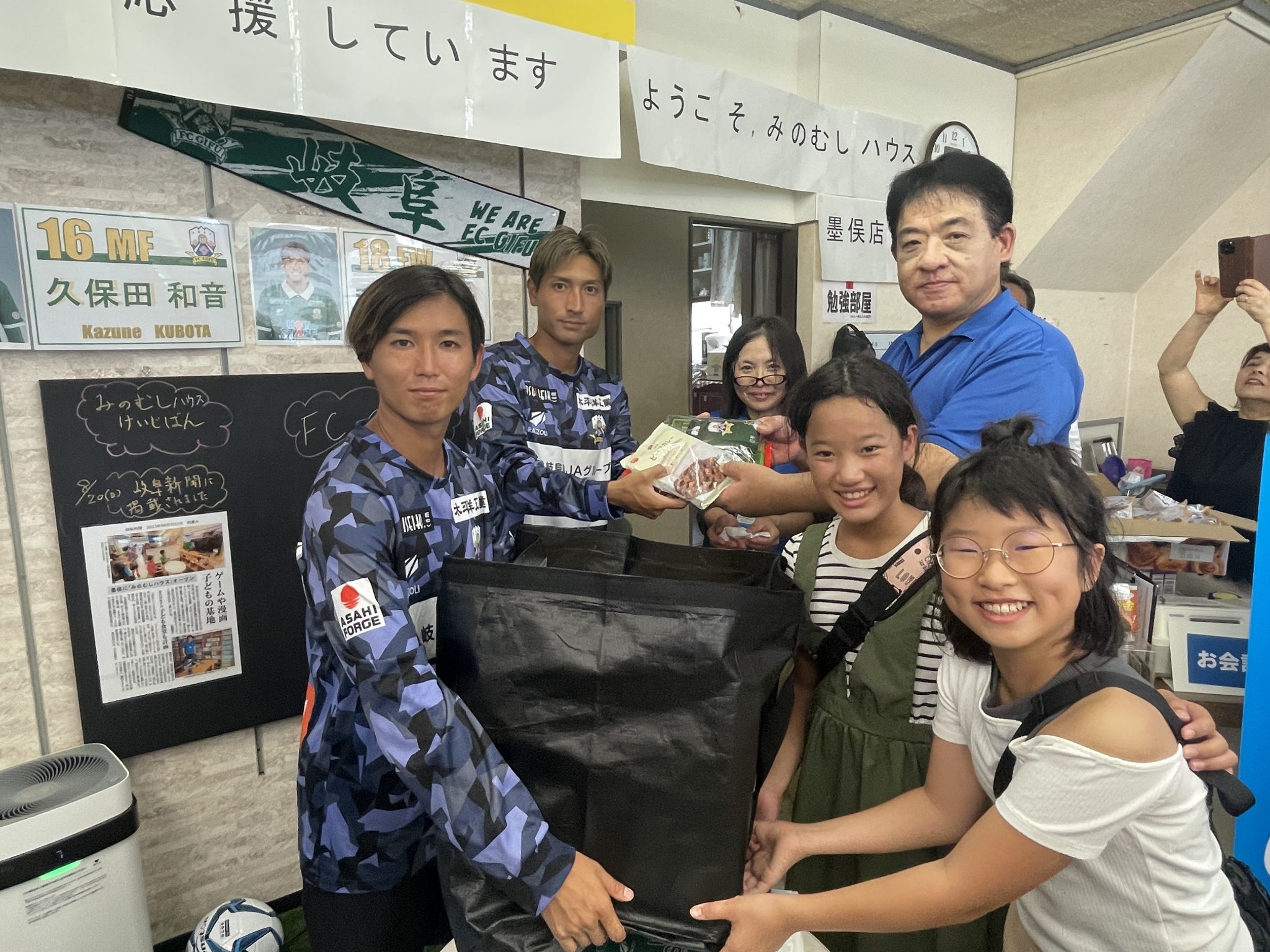 8月22日(火)田中順也選手と大垣市ホームタウン応援大使を務める久保田和音選手が大垣市にある子どもの居場所「みのむしハウス すのまた」へ 毎ホームゲームで集めている食品をお届けしました。