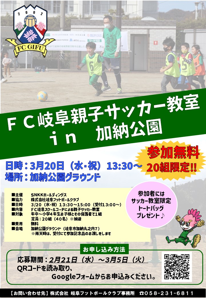 ☆3月20日(水・祝)「FC岐阜親子サッカー教室in加納公園」