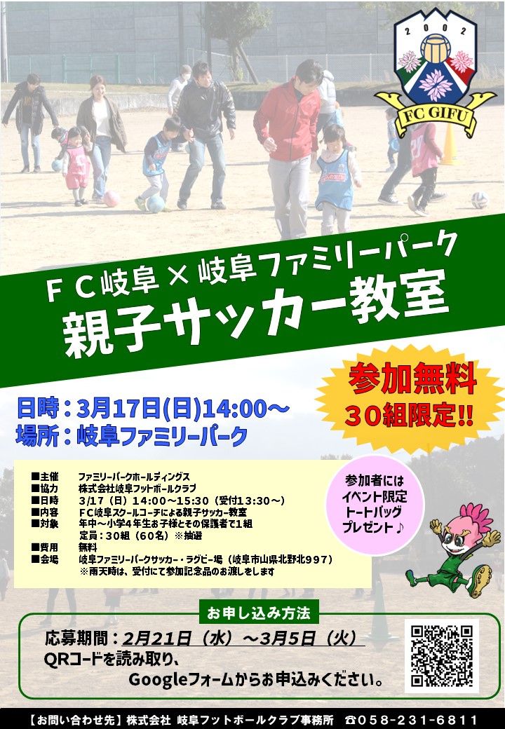 ☆3月17日(日)「FC岐阜親子サッカー教室in岐阜ファミリーパーク」