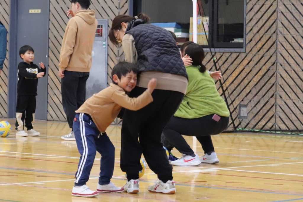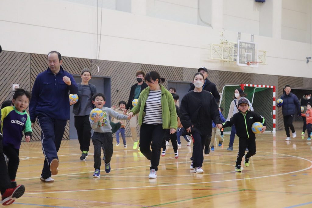 手を繋いで走ったり、親子でボールフィーリングにも挑戦。