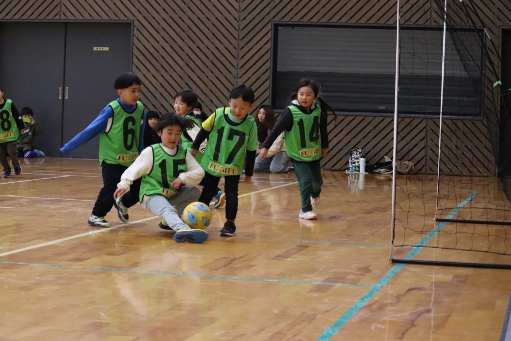 幼児の部ではお父さん、お母さんに見守られながらドリブルシュート!