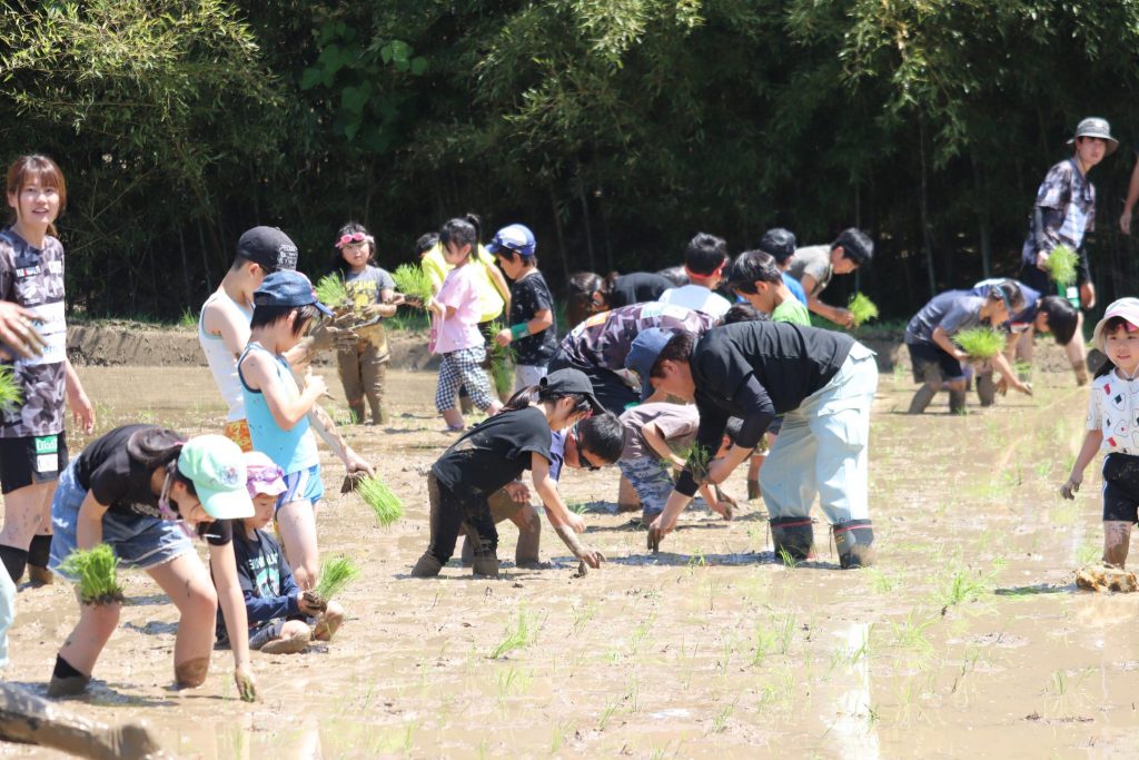 田植えが初めてという子どもたちがほとんどで、目印の線に沿ってハツシモの苗を手植えしました。