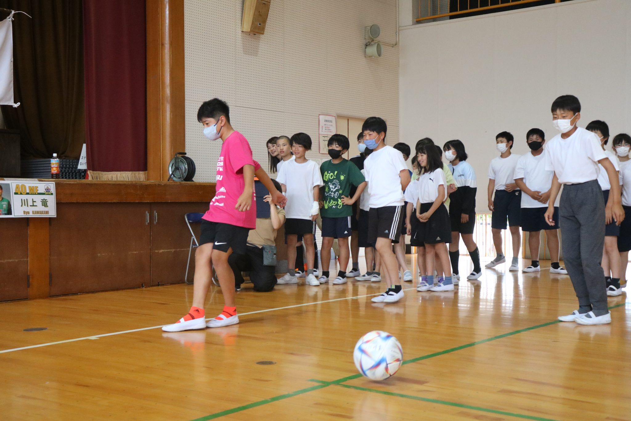 サッカーを通して学んだことをテーマに自身が小学生の頃の話をしながら「好きなことに熱中して一生懸命頑張ることの大切さ」を伝えていました。